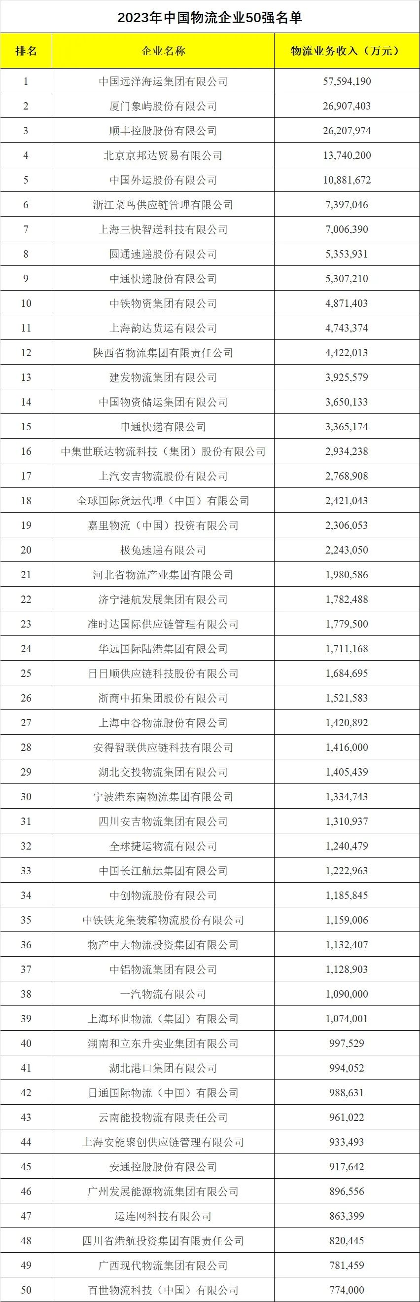 “中国物流企业50强”2022年物流业务收入合计23456亿元,按可比口径计算,同比增长13.4%。其中,中远海运以超5759亿元的物流业务收入排名“中国物流企业50强”第一,顺丰控股领衔“民营物流企业50强”。