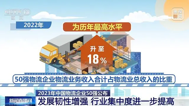 50强物流企业门槛77.4亿元,比上年增加15.8亿元。50强物流企业物流业务收入合计占物流业总收入的比重升至18%,为历年最高水平。