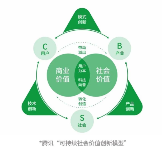 马化腾在文中指出,两年多来,腾讯逐渐形成了以核心能力为依托、与社会各方共创的三大可持续社会价值创新方向,取得了一定成果。“我们对一个更加可持续与高质量发展的腾讯有了清晰的图景:它是真正科技向善的,是关心人的价值与社会的可持续发展的,是呼应时代与国家发展需要的。它从服务用户(C),发展到服务产业(B),再到服务社会(S),最终指向是为社会创造价值。‘CBS三位一体’是它的新形态,商业价值与社会价值在其中不是此消彼长,而是相互融合、共生发展,共同实现规模化增长。”