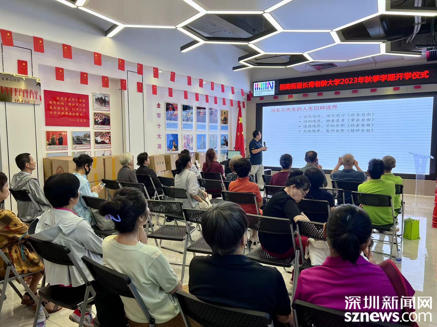 深圳新闻网2023年8月16日讯(记者 卢东勃)招商街道长青老龄大学秋季学期开学仪式暨开学第一课《大国崛起与文化自信》(国学系列课程第一讲)8月14日上午在花果山社区新时代大讲堂举行,国学班30名注册学员和花果山社区老年协会理事(队长)近50人参加。