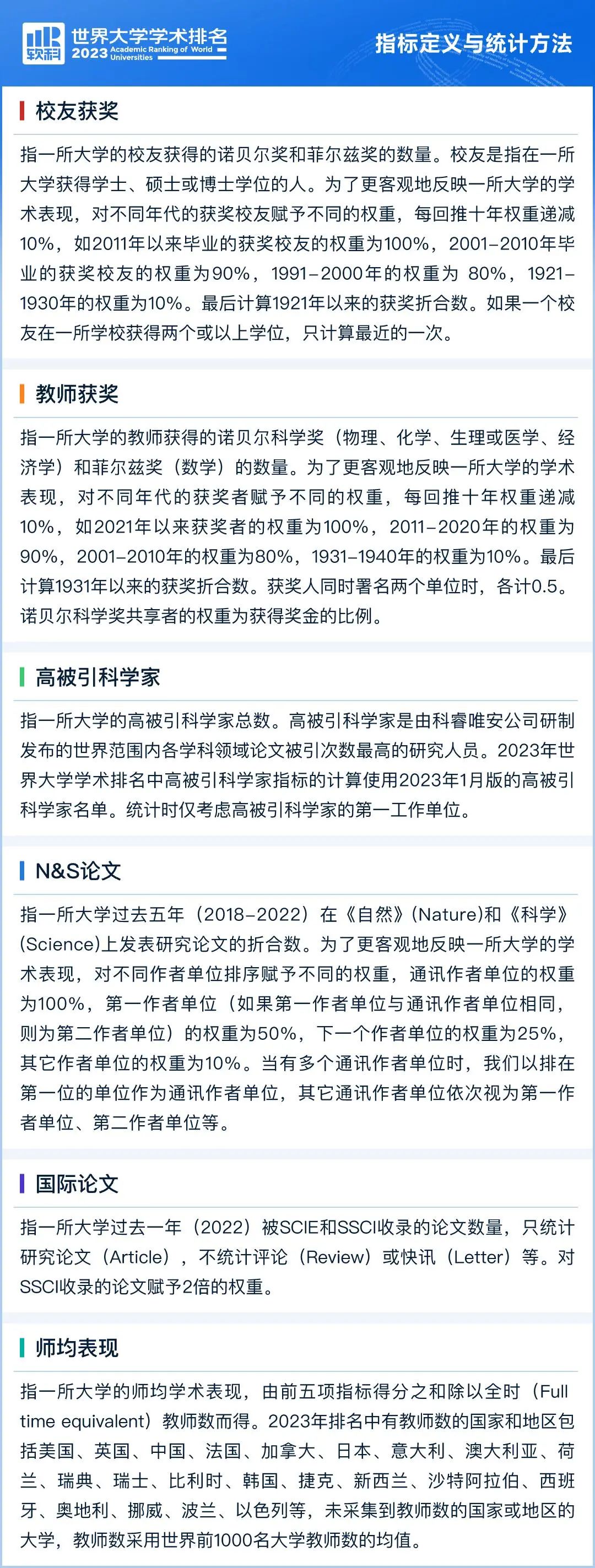 世界大学学术排名选择获诺贝尔奖和菲尔兹奖的校友折合数(简称“校友获奖”)、获诺贝尔科学奖和菲尔兹奖的教师折合数(简称“教师获奖”)、各学科领域被引用次数最高的学者数(简称“高被引科学家”)、在《自然》(Nature)和《科学》(Science)上发表论文的折合数(简称“N&S论文”)、被科学引文索引(SCIE)和社会科学引文索引(SSCI)收录的论文数(简称“国际论文”)、上述五项指标得分的师均值(简称“师均表现”)等六个指标对世界大学的学术表现进行排名。