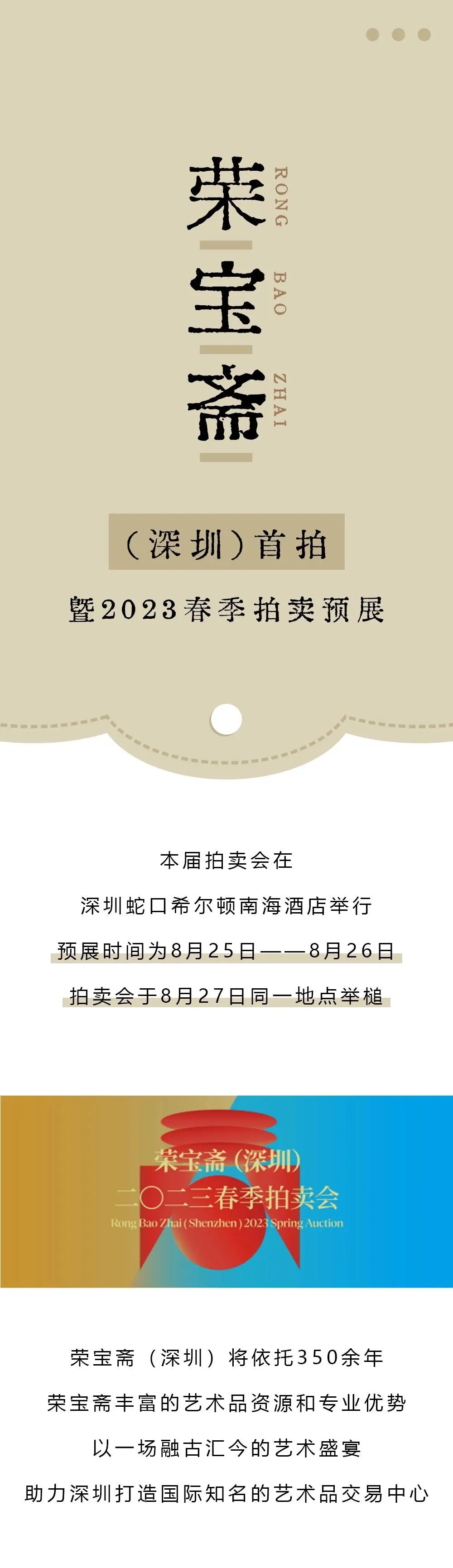 荣宝斋(深圳)首拍,以荣宝斋珍藏的齐白石《蔬果花鸟册》《荷花鸳鸯》《行书对联》,黄宾虹《莲花峰初晴》《双峰古刹》以及董其昌《青林长松图》等6件名家力作领衔,亦包括50余件质量上乘的荣宝斋库存珍品。作品涵盖中国书画、佛教艺术、紫砂艺术、当代艺术、当代设计与工艺等各大艺术门类,荟萃近八百件珍品佳构。