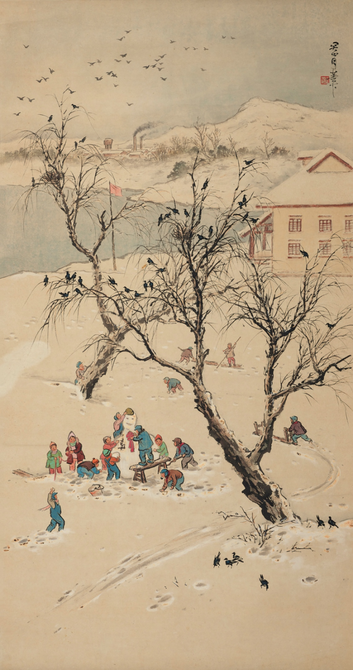 另有当代岭南画派的代表人物之一关山月精品现身,关山月秉承 “笔墨当随时代”和“折衷中西·融汇古今”的艺术主张,并始终不渝地贯穿于自己的创作实践、生活实践和教育实践之中。这幅“戏雪”是写实之作,描写中南美专家属生活区的雪后场景,一派喜悦祥和的气象,是关山月少见的题材。