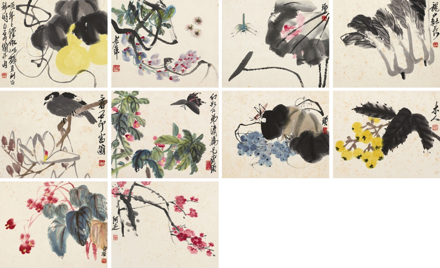 在该专场中,首推白石老人三件佳作。其一是齐白石十分精彩的《蔬果花鸟》十开册页为荣宝斋珍藏,内容包括红梅、秋海棠、枇杷、玉兰小鸟、紫藤蜜蜂、凤仙蝴蝶、荷花蜻蜓、葫芦、白菜以及葡萄蚂蚱,均是齐白石最为擅长且喜闻乐见的题材;另有白石老人钟爱的鸳鸯荷花,是齐白石92岁所作的《荷花鸳鸯》,正值齐白石晚年,尺幅之大,堪称齐派“红花墨叶”的经典佳作。