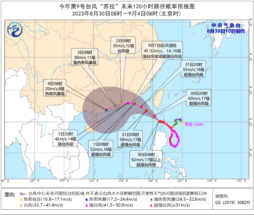 大风预报:8月30日14时至31日14时,我省中东部沿海将有6-8级、阵风9-10级的大风“苏拉”中心经过的附近海面的风力有14-17级、阵风17级以上。