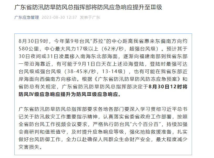 广东将防风应急响应提升至Ⅲ级