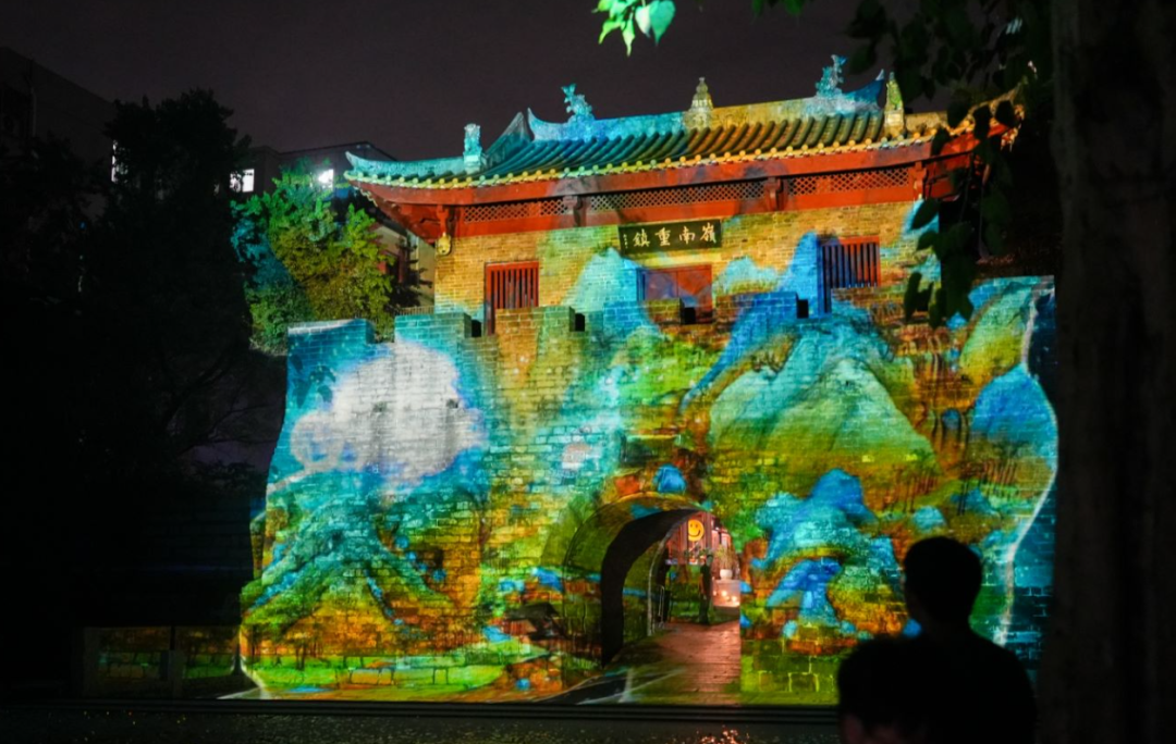 光影秀表演如梦似幻,在炫彩光影的交叠变幻中,南头古城关一时如雾中蜃楼,一时如斑驳旧城,一时又如琉璃之城……科技幻彩让人遐想出一幅幅满载故事的历史画卷。点亮意大利古建筑、绿水青山、新安县衙的点点灯光在南头古城墙上摇摆、旋转,流光溢彩,交相辉映。转眼,南头古城门、轮船、大提琴、音符、地图等映入眼帘,月亮等投射在南头古城南城门上,把南头古城的活力和历史文化演绎得恰到好处。最后,“‘城新城意’南头古城开街三周年”映射在南头古城城墙上,把现场气氛推向了高潮,让市民游客直呼过瘾。