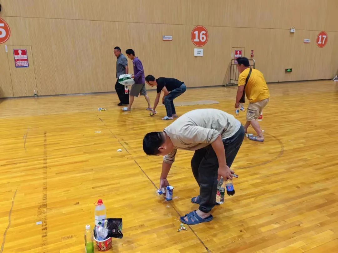 场馆内的工友们或坐或躺或打牌或聊天。“红马甲”在场馆内外穿梭,将物资分发给工友们。刚搬上来的宵夜,也不断被送到工友们手中。宵夜是一饭四菜,荤素搭配。拿到宵夜的工友们围坐在一起,相互分享着不同的菜肴。也有工友招呼着“红马甲”们,邀请他们坐下来一起吃宵夜。