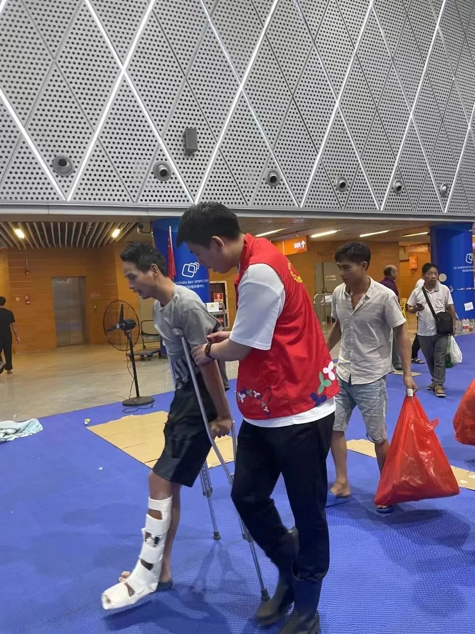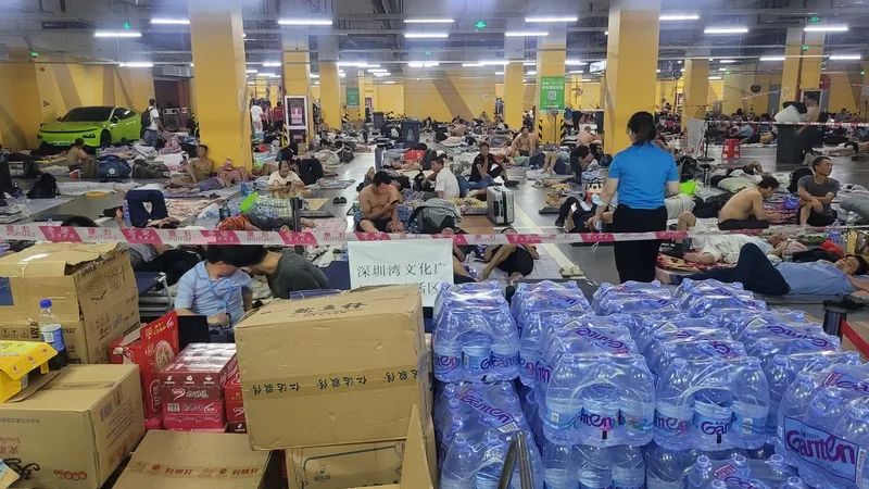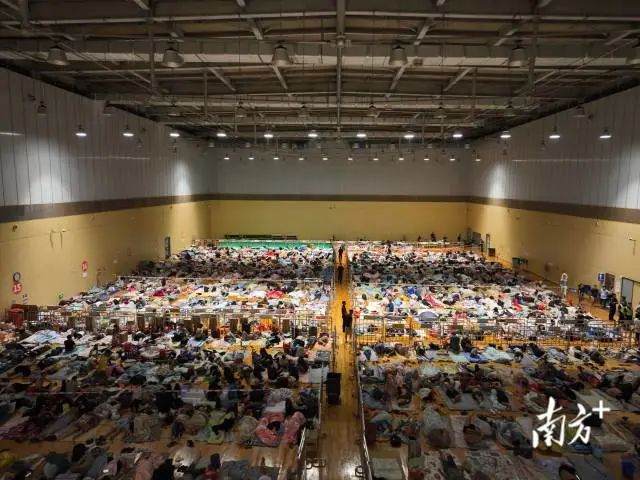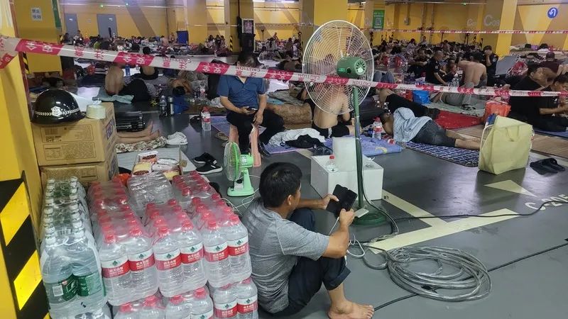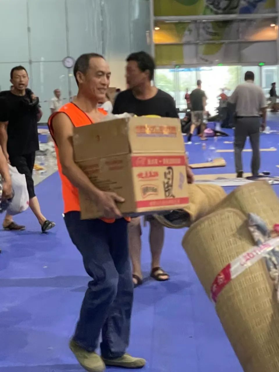 9月1日下午3点多,南山区风雨正盛,来自周边十个项目的3917位工友被转移安置在体育馆内。尽管外面倾盆大雨,但体育中心里灯火通明,工友们有说有笑,仿佛“苏拉”仍在千里之外。