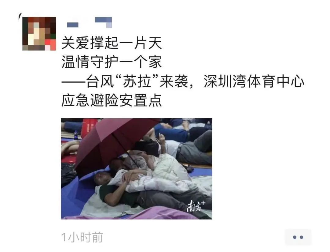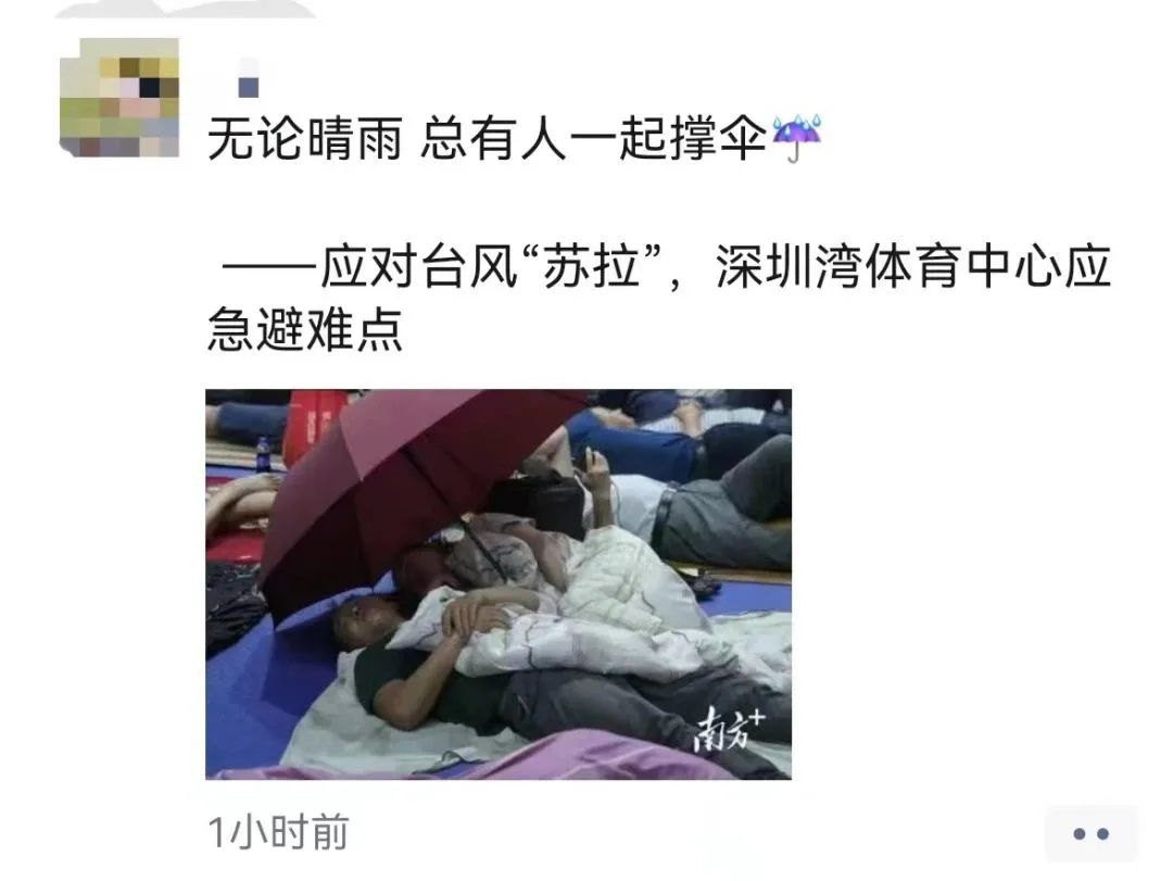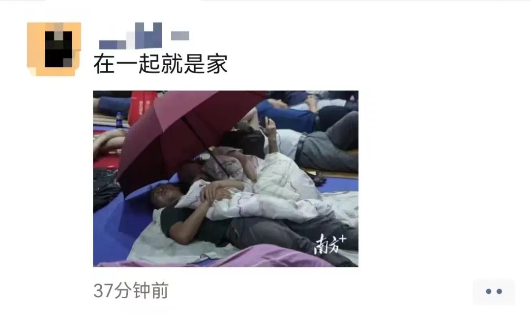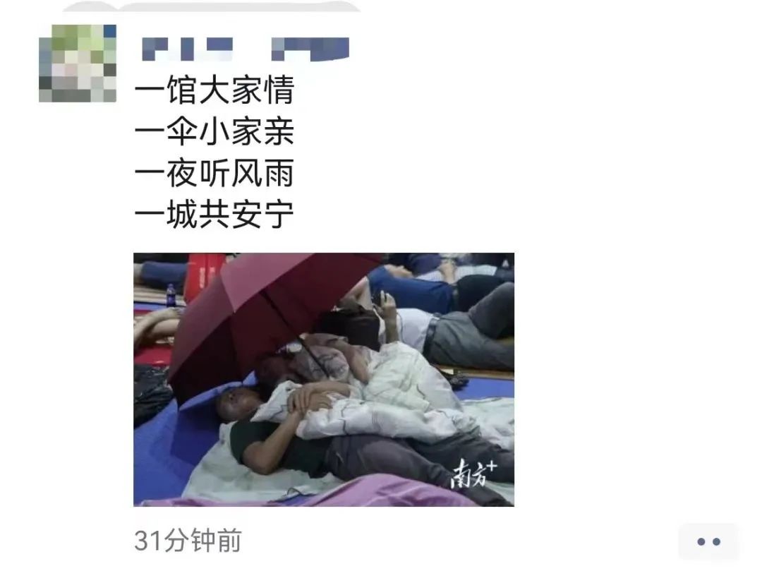 来自云南的瓦工老李已经在广东生活了十几年,有着丰富的“避难”经验。上次“山竹”要来时,他就卷好了铺盖,时刻准备着。“在深圳这么多年,离春茧很近,但从来没有这么近距离地看过它,这次是零距离了。”老李轻松地开起了玩笑。在广东,台风司空见惯,这次“苏拉”来袭,他们都觉得“有点可怕”,但是有政府在他们就很安心。这时老李的妻子打来视频电话,老李把手机凑近饭盒给妻子看,让她放心。