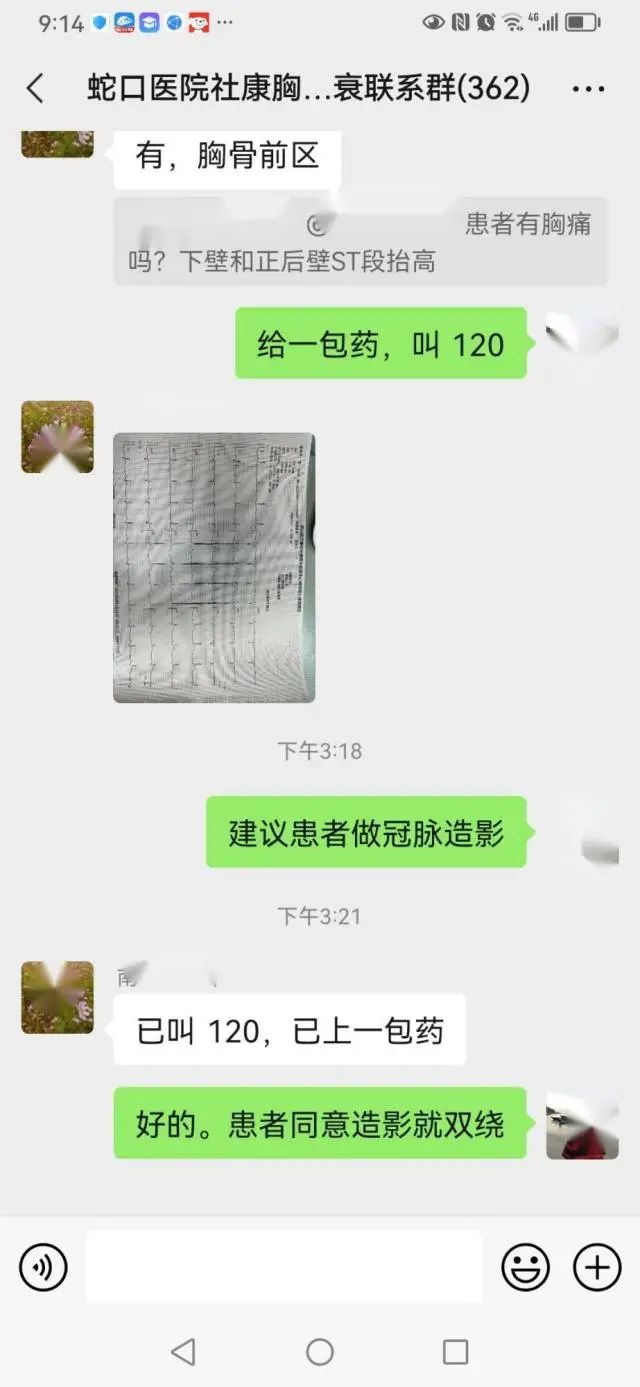 据了解,患者梁先生,50岁,其既往有血压病、脑出血病史,因反复胸闷痛3天,加重4小时,于当日下午15:08就诊于南水社康。社康医生立即给其做心电图,并上传到社康与该院胸痛中心的联络群。