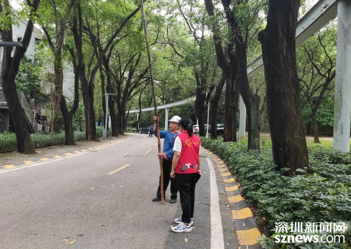 指导小区绿化园工清理枯枝落叶