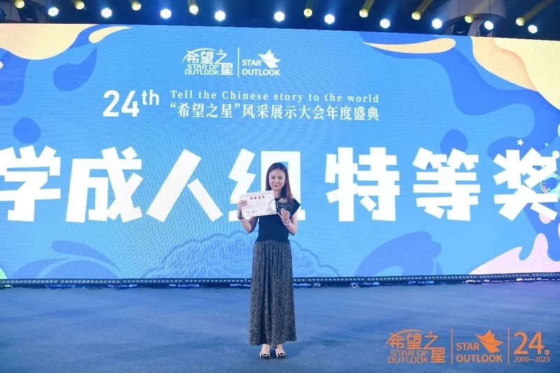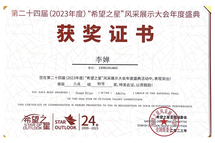 深圳新闻网2023年9月8日讯 (记者 徐哲康 卢东勃 ) 近日,为期两天的第二十四届“希望之星”英语风采展示大会全国总决赛在北京落下帷幕。经过层层考核,激烈角逐,来自深圳市南山外国语学校(集团)第二实验学校的英语教师李婵,凭借出色扎实的专业实力位列全国十强,斩获本届大赛“全国特等奖”。