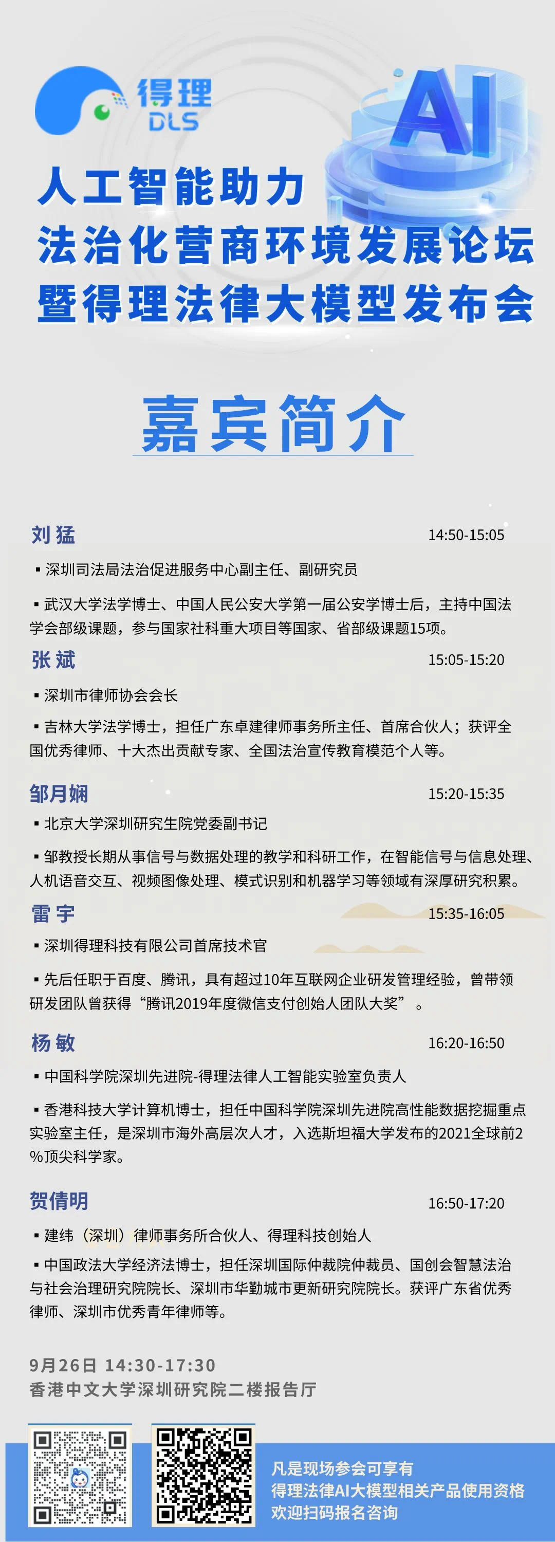 深圳新闻网2023年9月21日讯(记者 董非)为推进法律服务的智能化和数字化进程,助力深圳打造高质量的法治化营商环境,中国科学院深圳先进院-得理法律人工智能实验室以及深圳得理科技有限公司将于2023年9月26日在香港中文大学深圳研究院举办人工智能助力法治化营商环境发展论坛暨得理法律大模型发布会。论坛将邀请中科院深圳先进院、北京大学深圳研究院等知名科学家,联手深圳法律界的行业领袖,共同研讨人工智能与法治化营商环境的发展话题。