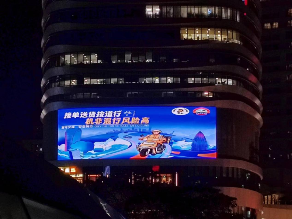 骑手小哥穿梭在城市的大街小巷,南山交警精心制作了交通安全公益广告及骑手遵规守礼文明“四员”海报,在全区66处户外大屏和2000余个快递柜屏幕滚动播放,让安全提醒遍布到骑手经过的每个角落。