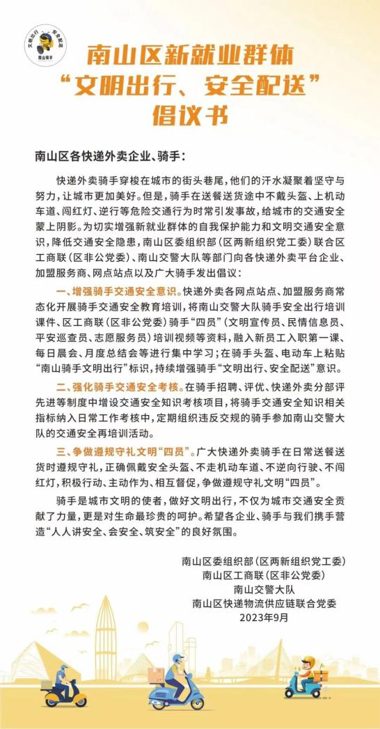 近年来,快递外卖骑手在驾驶电动自行车送货送餐时不戴头盔、上机动车道、闯红灯、逆行等危险交通行为时常引发事故,为此区委组部联合区委宣传部、区应急管理局、区城管和综合执法局、区工商联(区非公党委)、市交通运输管理局南山管理局、南山交警大队、区市场监督管理局南山监管局等部门和各街道协同发力,开启“护航暖‘新’,安全同行”行动,“宣教治”三位一体,着力增强新就业群体的自我保护能力和文明交通安全意识,规范其交通行为,为新就业群体暖心护航,为安全南山增添保险。