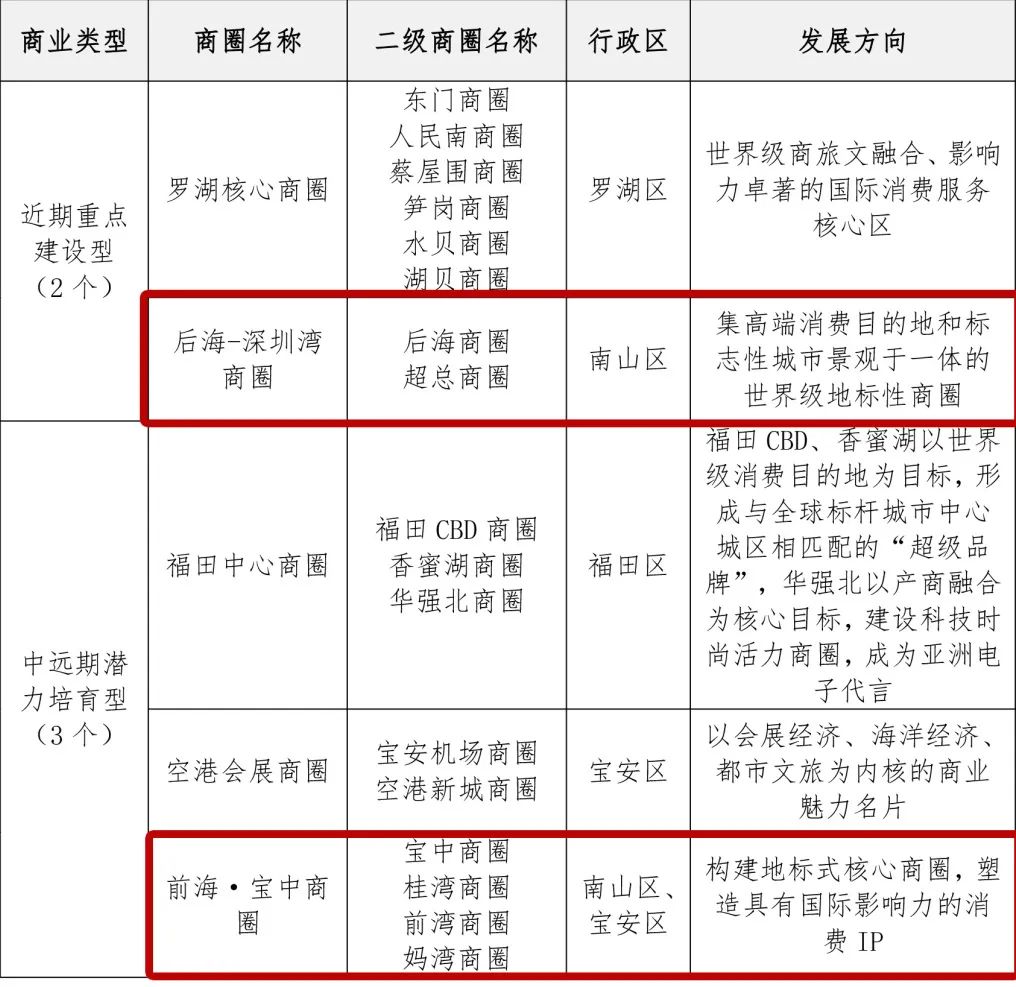 以前海深港现代服务业合作区为依托,重点打造妈湾、前湾、桂湾、宝中等核心区域,融汇高端商务服务、深港创意、人文休闲、滨海体验等功能,聚集国际大牌、时尚潮牌、首店经济以及城市TOD商业、城市文化公园等功能主体,因地制宜打造多元化商圈载体形态,聚焦“亲海城区”“港味突出”等元素,突出国际性繁华街区商业和湾区滨水生活体验,发展消费新模式,创造消费新场景,打造区域协同、商业联动、功能多样的商圈体系,构建沉浸式、体验感、具备窗口展示功能的地标式核心商圈,塑造具有国际影响力的消费IP。