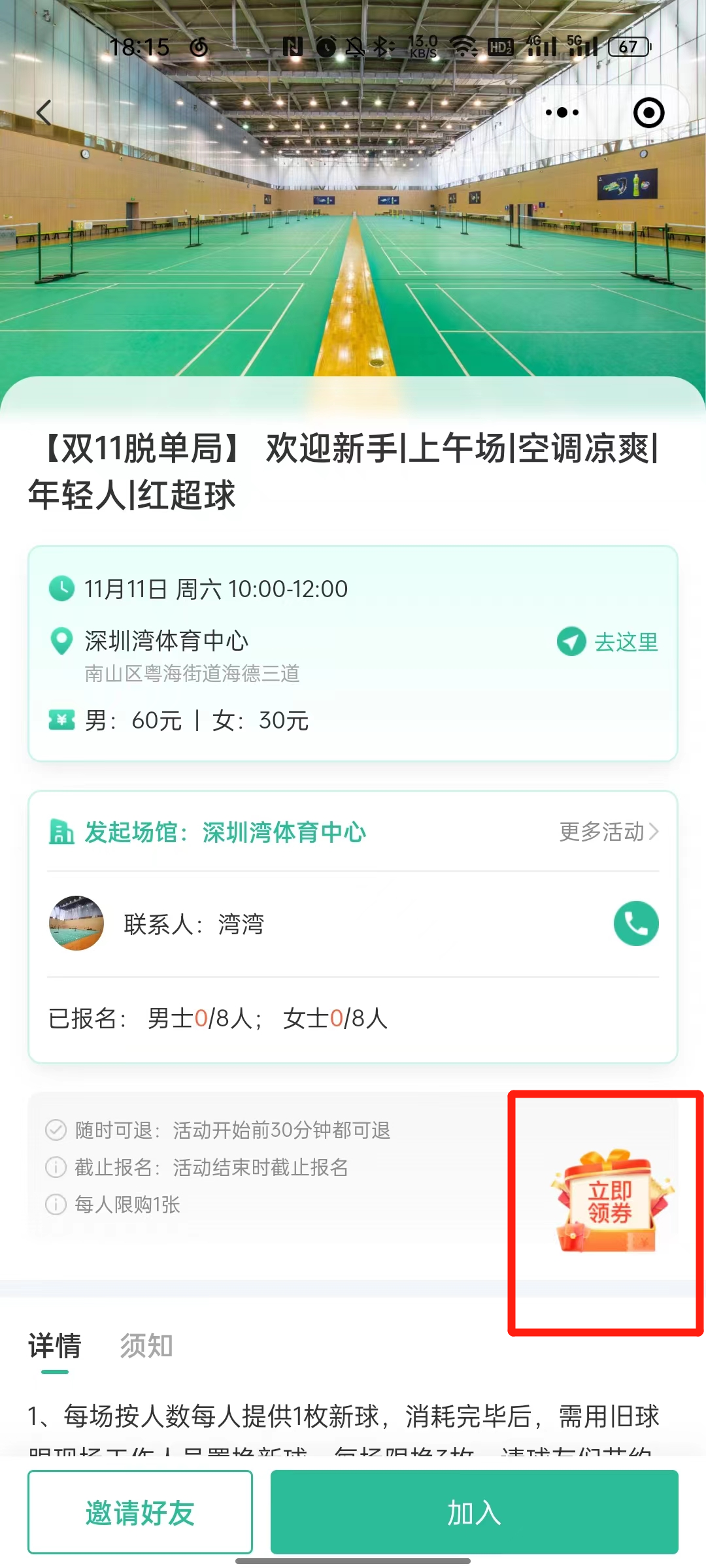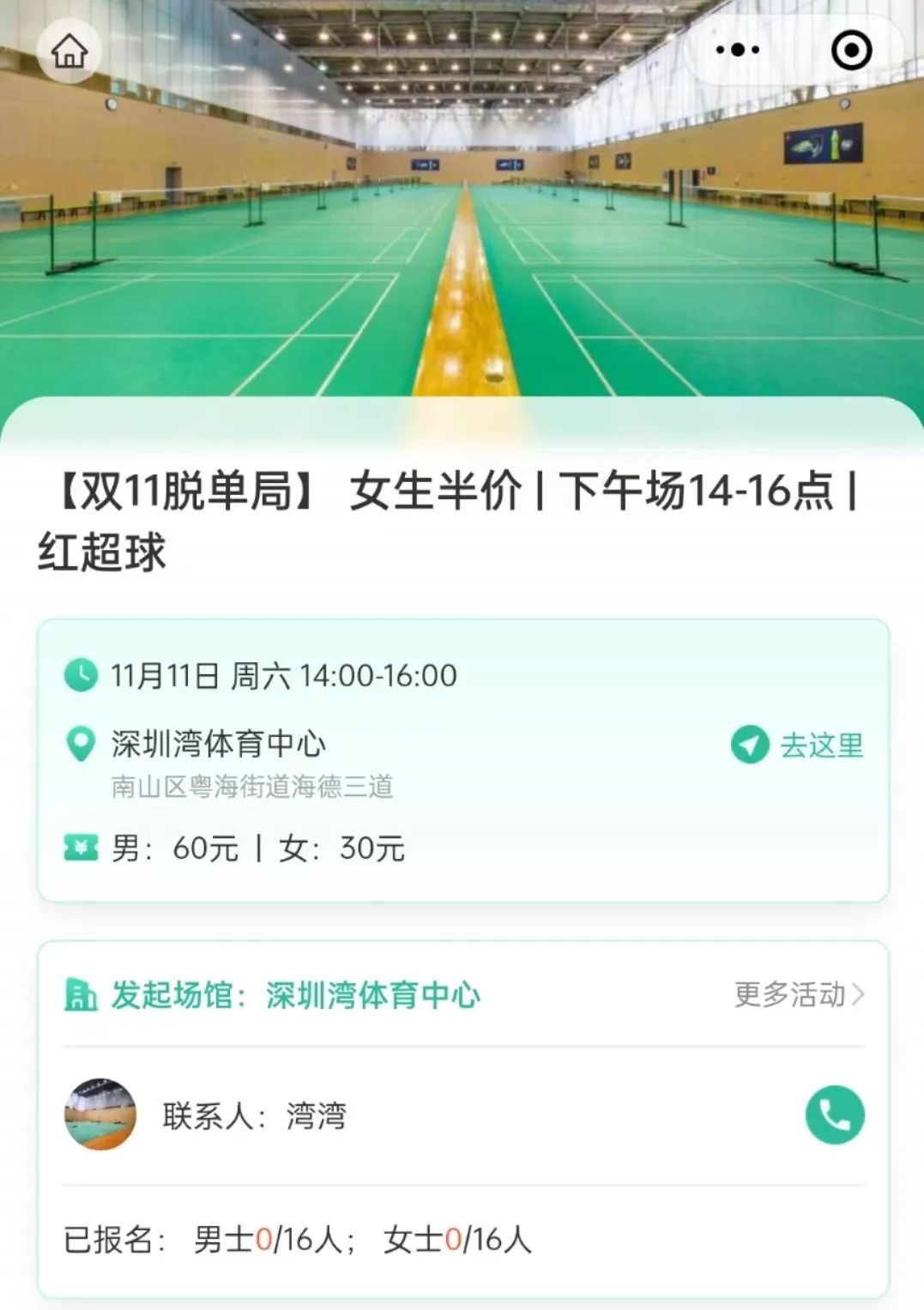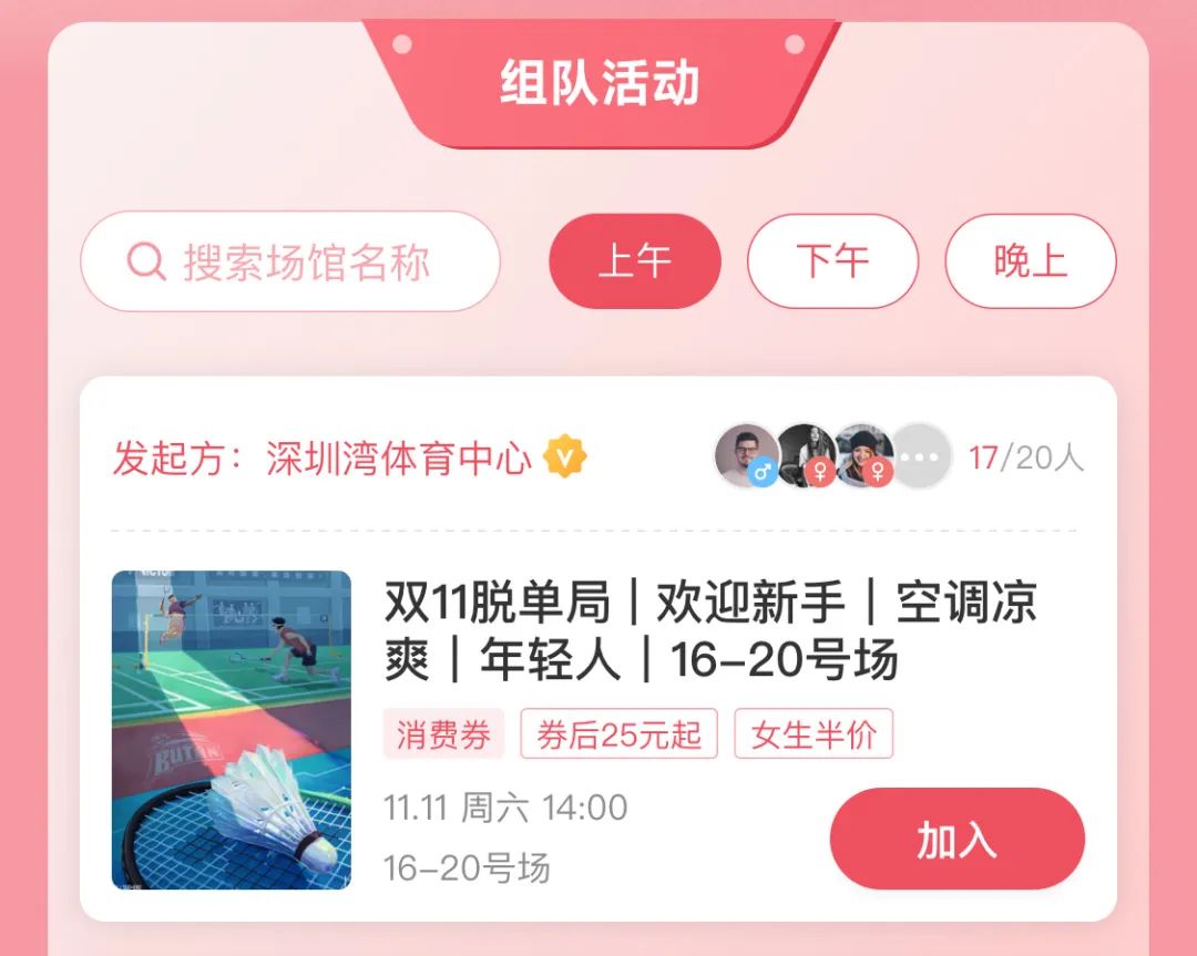 二、在首页点击“双11羽毛球运动交友脱单局”入口,即可进入活动参与拼团页面: