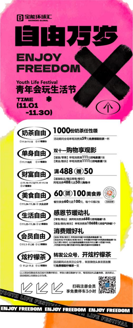 内容:举办“自由万岁 ”青年会玩生活节主题活动,推出消费满赠奶茶/电影票、优惠团购等活动,涵盖餐饮、服装、黄金、数码、教培等多个品类。