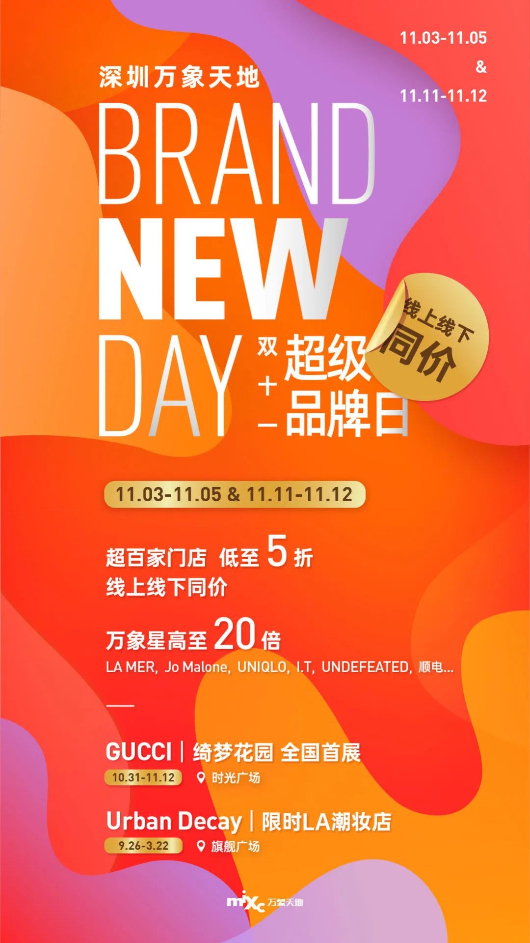 内容:举办深圳万象天地BRAND NEW DAY双十一超级品牌日,通过超百家门店低至5折、线上线下同价、万象星高至20倍等促销形式拉动消费提升。