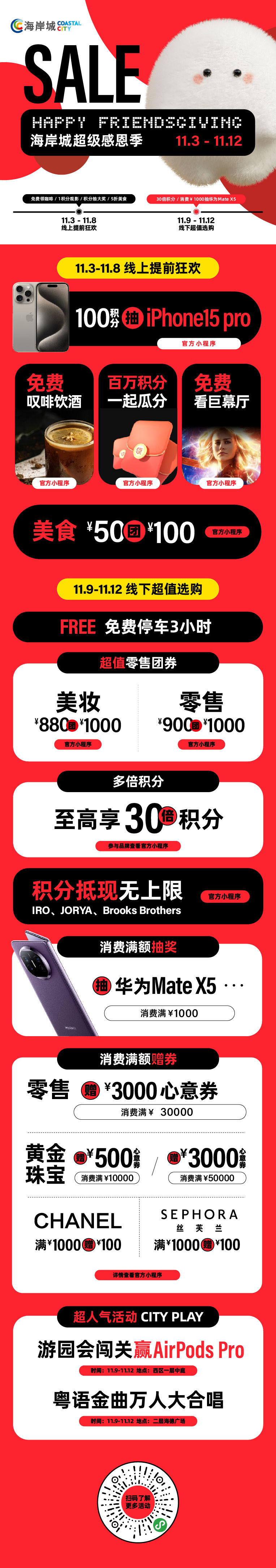 内容:举办“海岸城会员感恩季”,发放覆盖350多家零售、餐饮、美妆、国际名品、黄金珠宝等品牌的限时优惠,通过积分兑礼、满额赠礼、消费折扣等内容,实现会员消费体验升级。