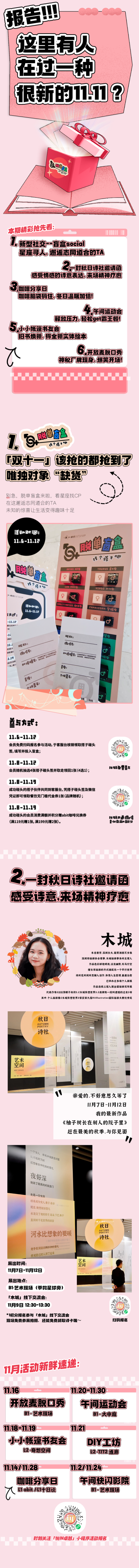 内容:举办午间快闪影院、狼人杀游戏趴、秋日诗社、咖啡分享日、不吐不快开放麦、小小帐篷书友会、in趣玩趴、白领运动会、星酷童模大赛、脱单盲盒等活动,配合推出秋日咖啡券包、咖啡星球集章兑奖、双十一当日专供等形式举办促消费活动。