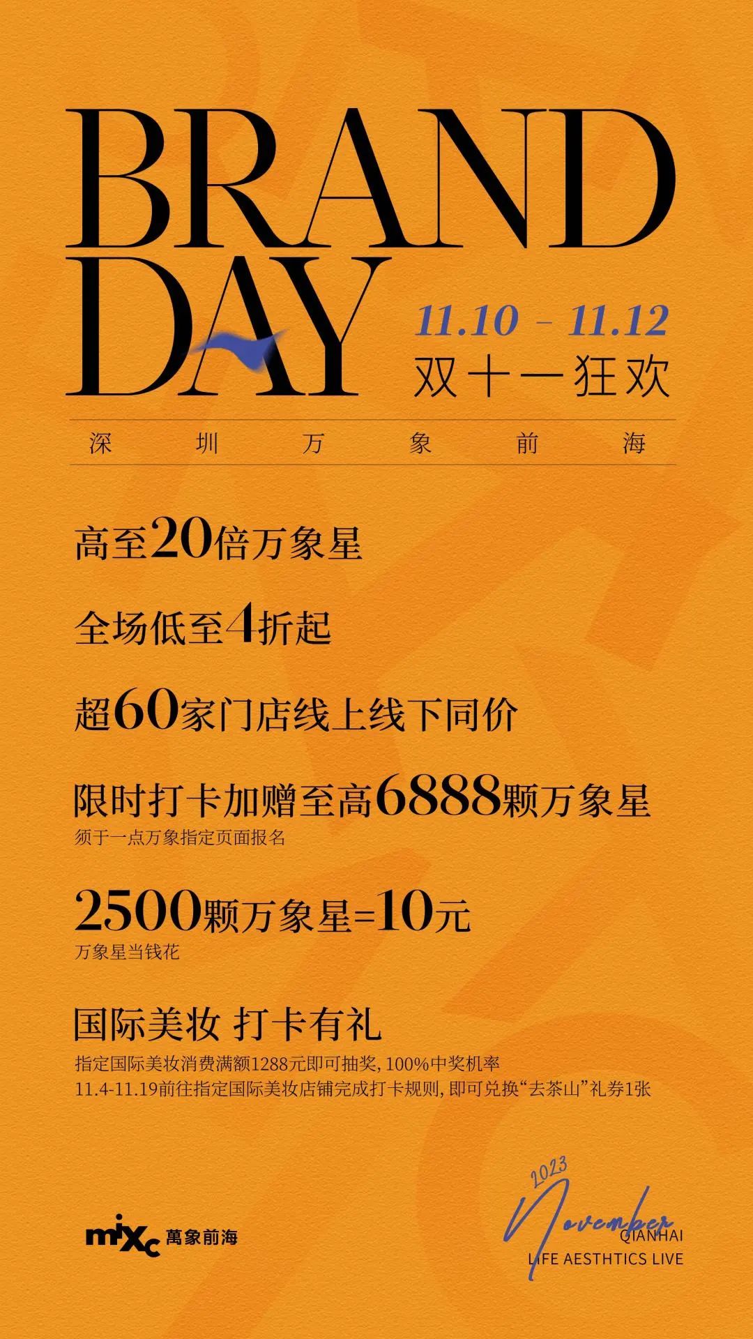 内容:举办万象前海双十一狂欢,促销内容包括高至20倍万象星、全场低至4折起、超60家门店线上线下同价、限时打卡加赠至高6888万象星、国际美妆,打卡有礼等促销活动。