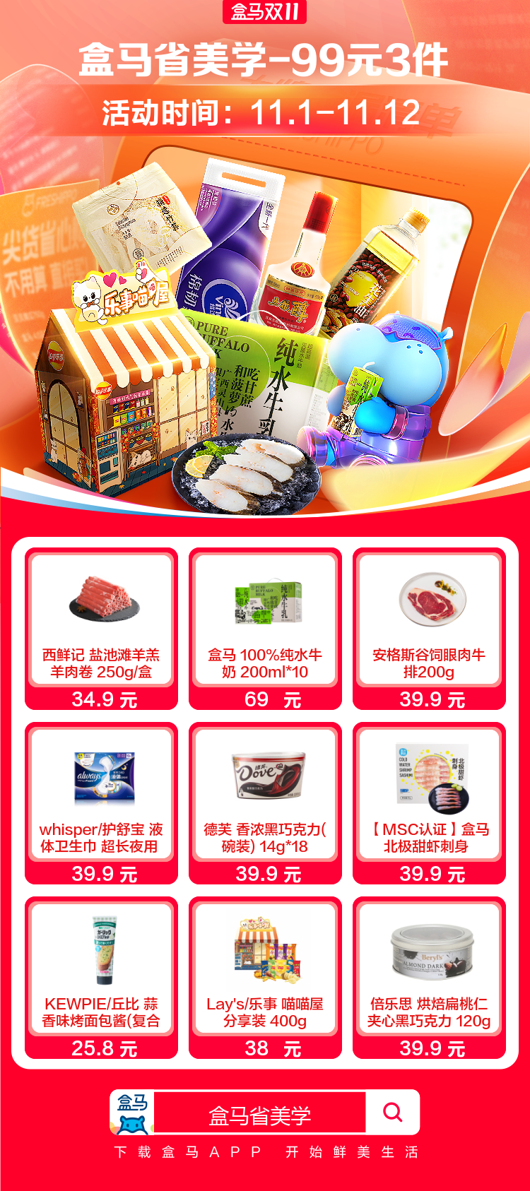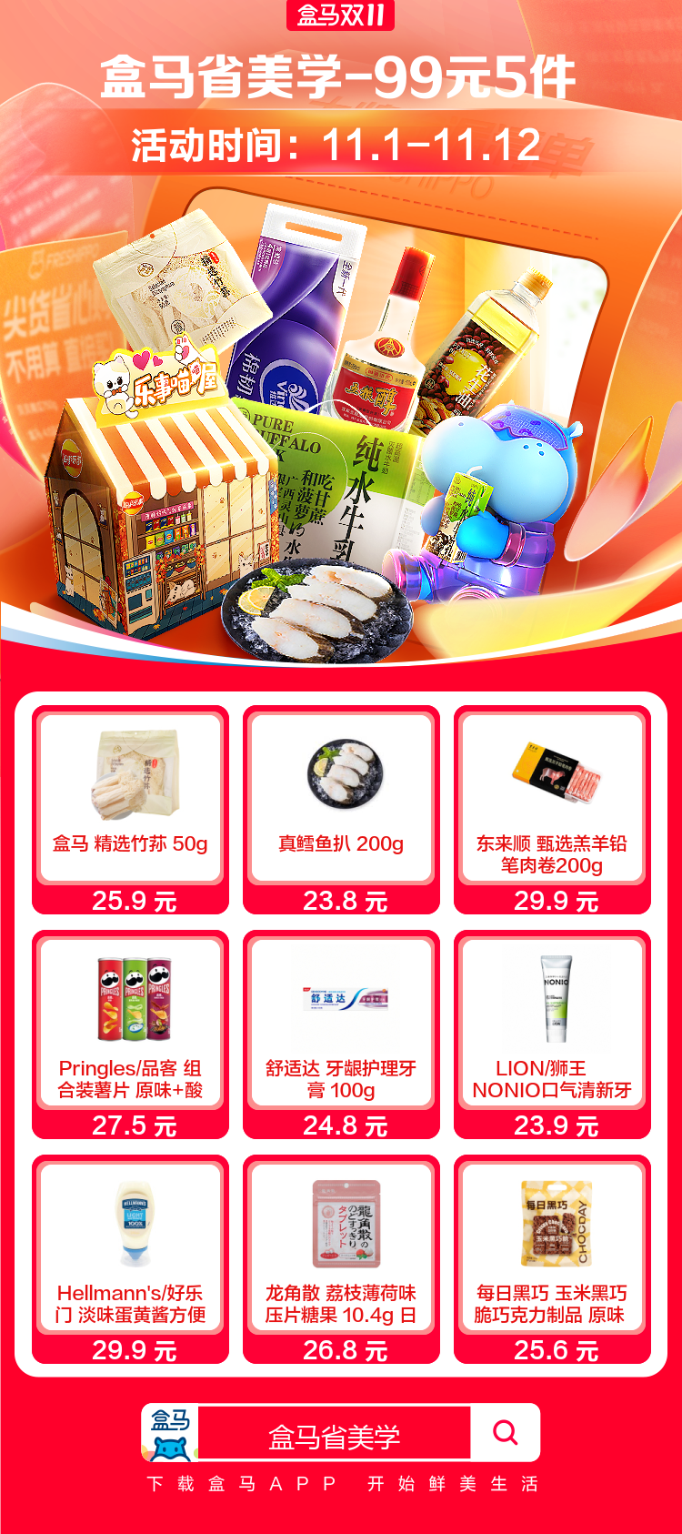 内容:围绕“盒马双十一”启动盒马省美学活动,推出99元6件、99元5件、99元4件、99元3件的商品组合。