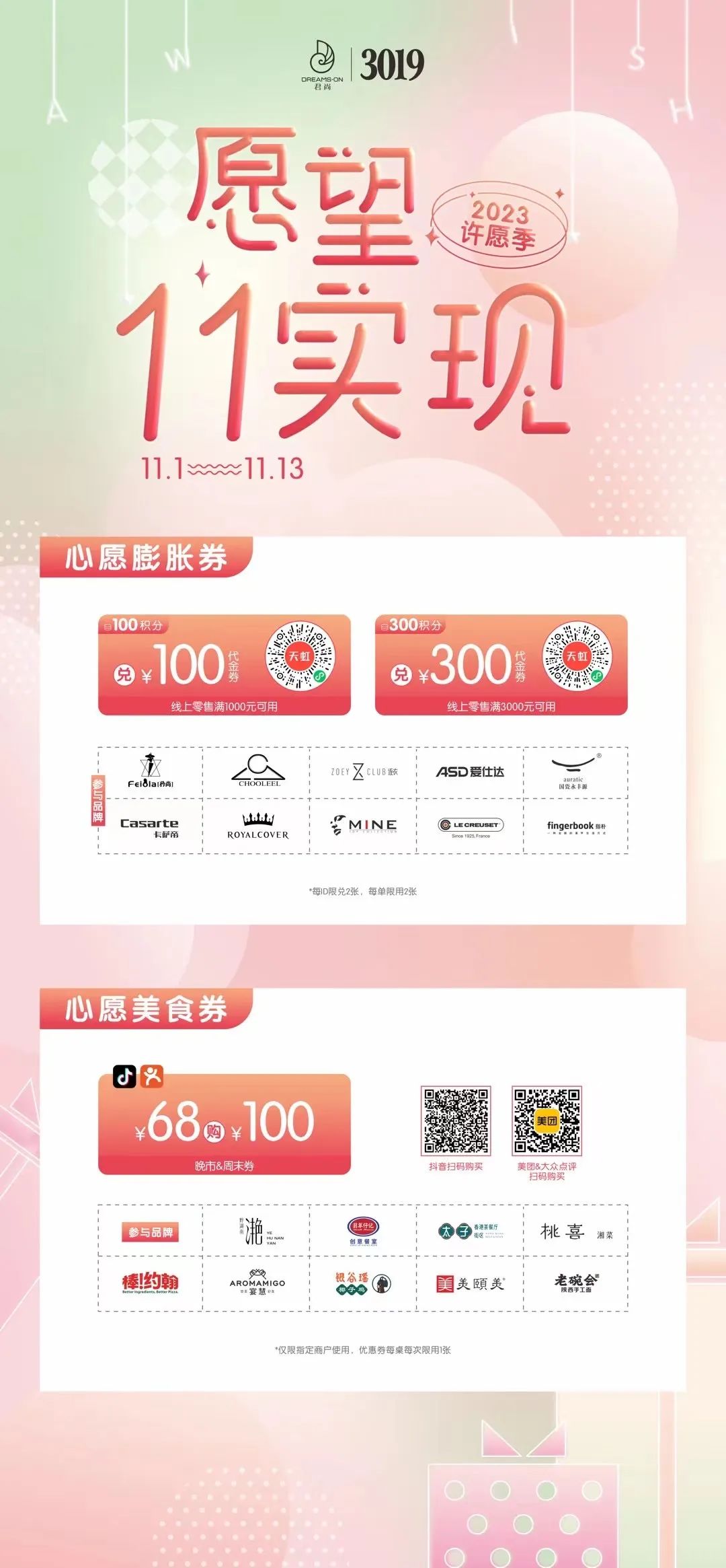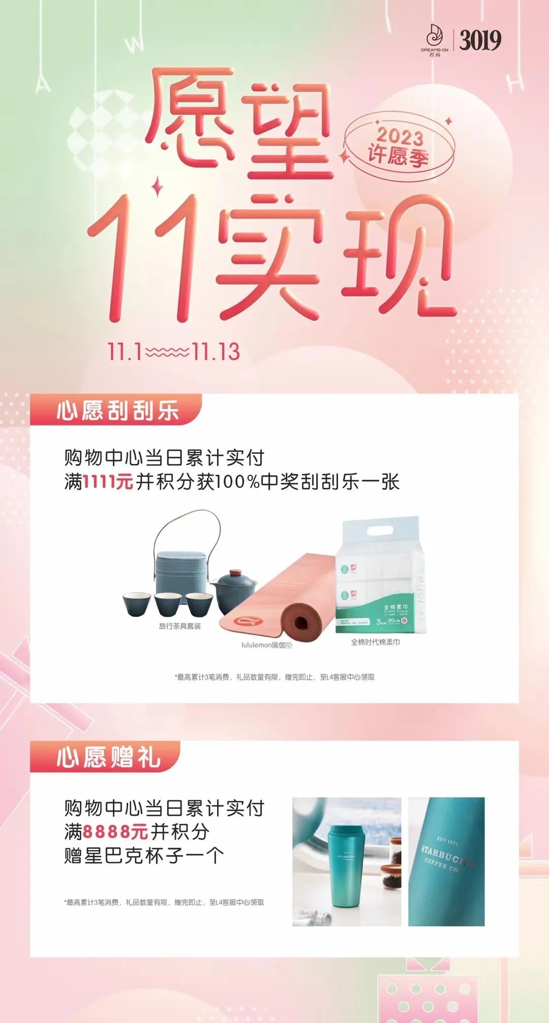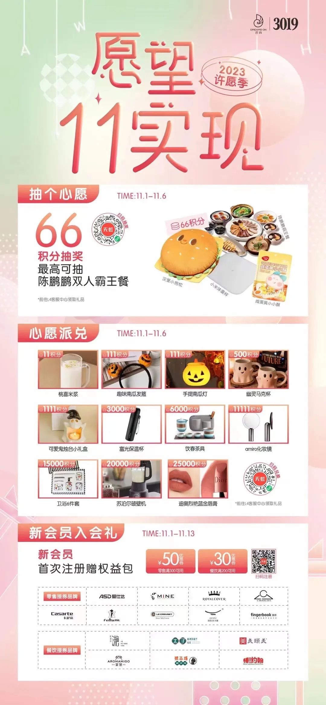 内容:举办“愿望11实现”活动,联动商场内所有商户推出心愿膨胀券、心愿美食券、心愿派兑、新会员入会礼心愿刮刮乐、心愿赠礼等活动,提升购物氛围。