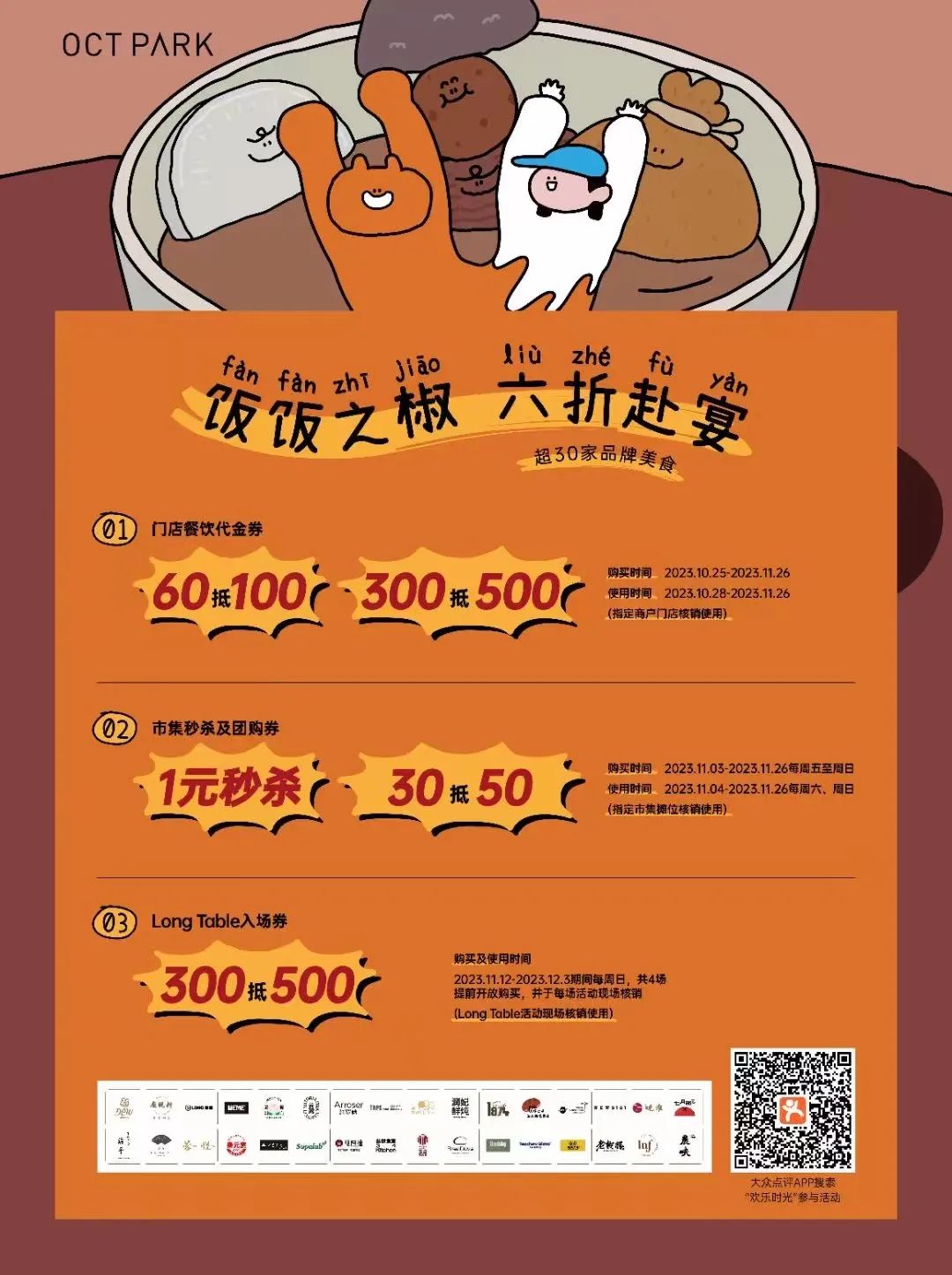 内容:推出欢乐时光OCT PARK 饭饭之“椒”·6折赴宴,包括60元抵100元、300元抵500元门店餐饮代金券,超30家美食商户可用!还有1元秒杀、30元抵50元市集秒杀团购券10+美食市集摊位可用。另有LONG TABLE 300元入场券,300元即可享受超过500元黑珍珠餐厅提供餐品。