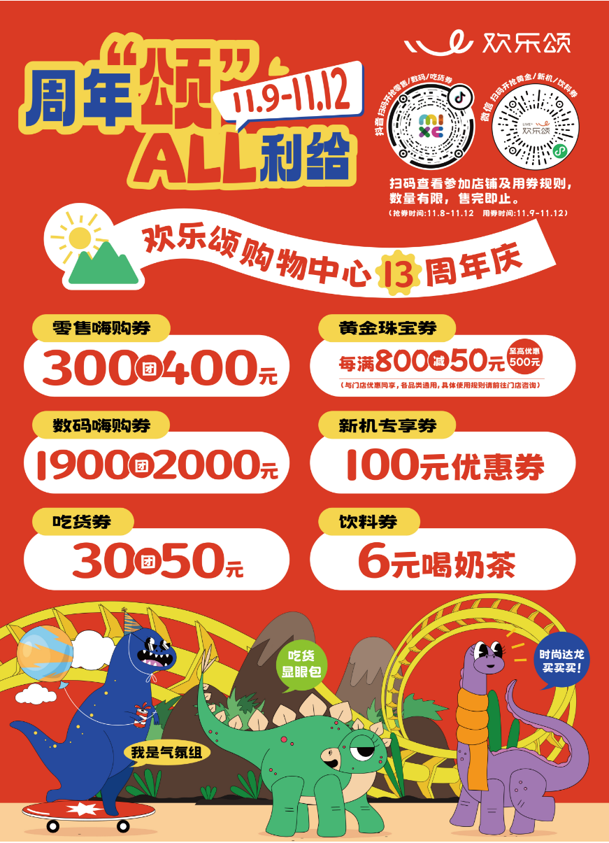 内容:结合欢乐颂购物中心13周年庆举办周年“颂”ALL利给,推出300团400零售券、1900团2000数码券、30团50吃货券50元黄金珠宝抵用券、10元新机专享券、6元畅享奶茶自由,全面提升消费氛围。