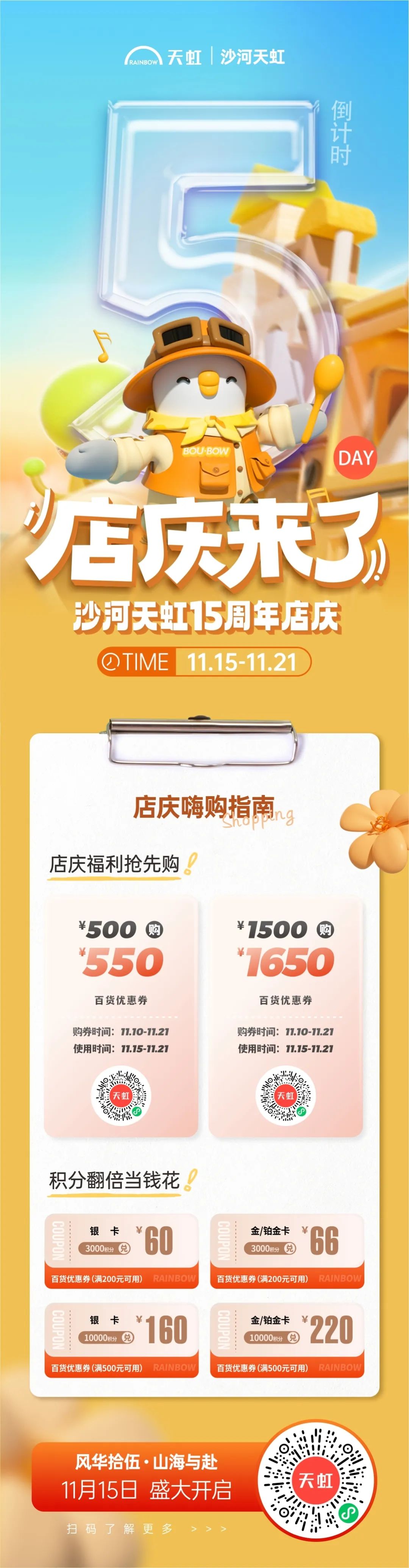 内容:围绕沙河天虹15周年庆,推出“万券齐发”500团550,1500团1650百货券、积分翻倍当钱花、消费满699参与抽华为mate60 pro等多个惊喜优惠。