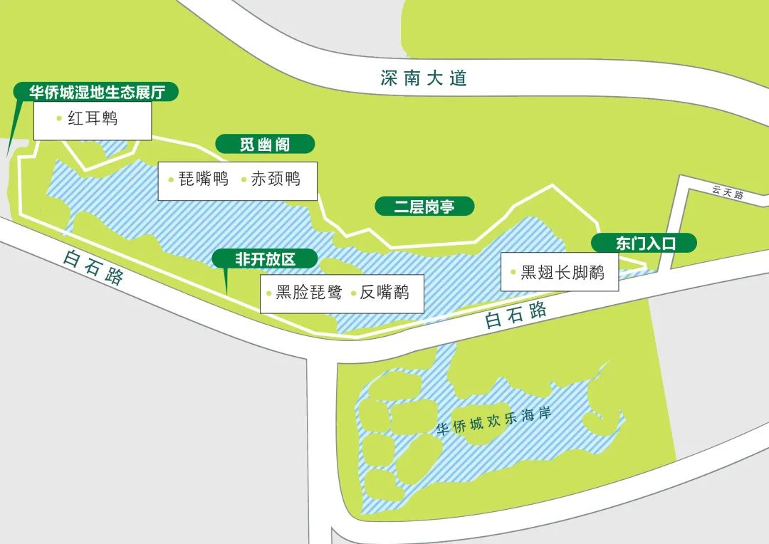 进出:免费,需预约(通过“华侨城湿地”微信公众号)。9:30-17:00开放(每周一、周三闭园)。