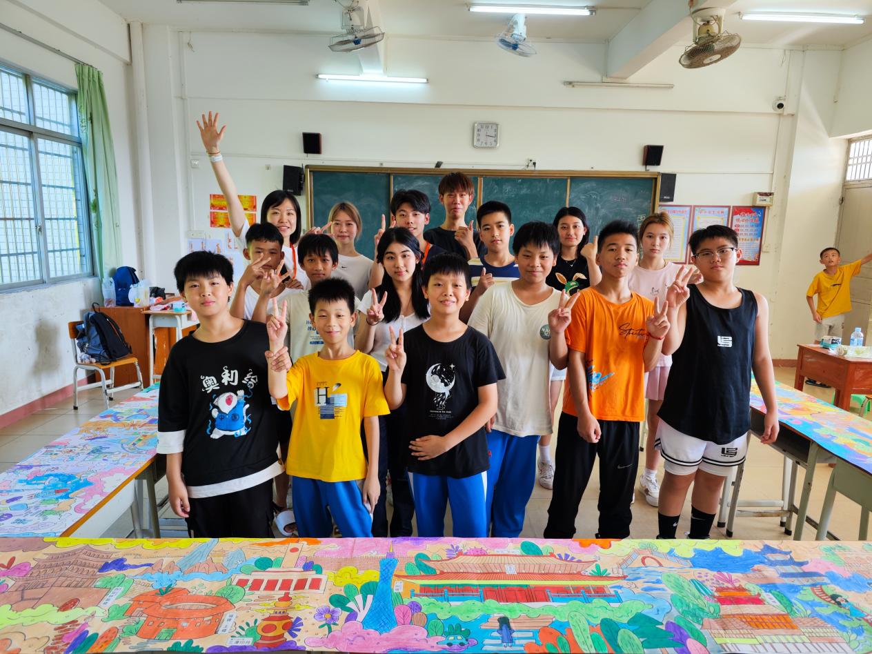 另外,此次与橙同行公益志愿者还开展了石咀小学校园文化翻新工作,不但绘制了新的板报,鼓励小朋友们“行则将至,做则必成”,同时还与小朋友们共同绘制了九米长的画卷,并提供后续的绘画线上课程,与他们一同天马行空地想象、创作。最终,伴随着图书室的成功搭建,画卷挂在了窗边与光秃秃的白墙上,微风吹起,画中的动物、人物和建筑都显得更加栩栩如生,为图书室平添了一份宁静与美好,也为石咀小学带来了一份色彩与童趣。