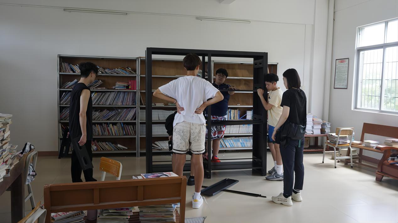 与2020年相比,虽然书本多了不少,但是书架布满尘土蛛网,有些木质的小柜子已经不堪重负。男生们将一批批新购置的书桌、书架进行组装,女生们则负责清空老旧书架,并将大量的书本、杂志进行分类整理。炎热的天气、海量的工作与两天的时间带给了与橙同行公益志愿者不少挑战——说明书的理解问题、零件和工具不全书籍分类不明、放置分散不便统一整理等等,都成为了令我们头疼的难题。
