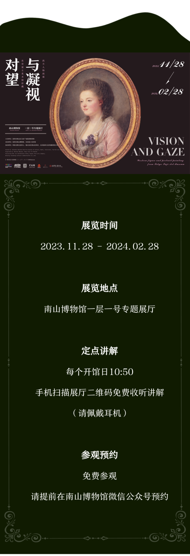 本次展览分为“神圣光辉”“王公贵族”“女性群像”“世间百态”四个章节,以“对望与凝视”主题为线索,时间作脉络,串联起各个时期的人物绘画及其风格特征,营造出一场场跨越时空的艺术对话,邀请观众一起进入不同的时代,凝视画中人的眼神,探寻各个时代背景下的故事,感受不同时代下大师们的生活方式、审美以及理想。