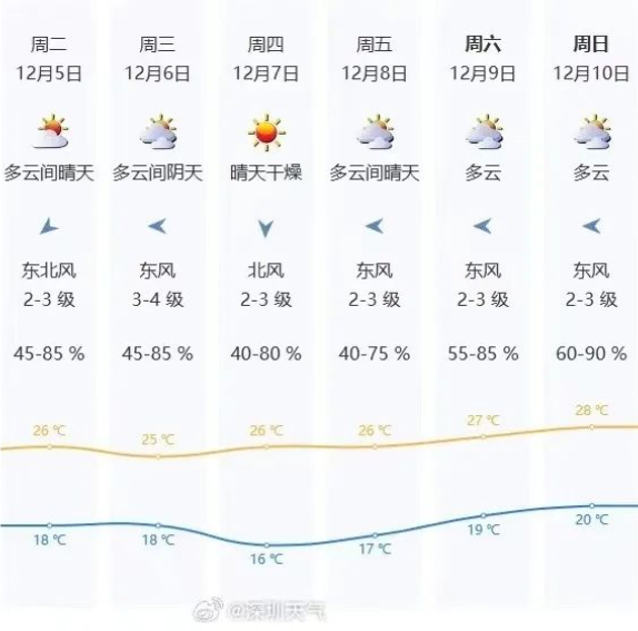 预计12日-31日深圳市冷空气趋活跃,气温波动加大,天气转冷。有2次明显冷空气影响,分别出现在中旬末和月底前后,期间伴有阴雨天气和8-10级最大阵风,下旬前后最低气温降至10℃以下,体感阴冷。