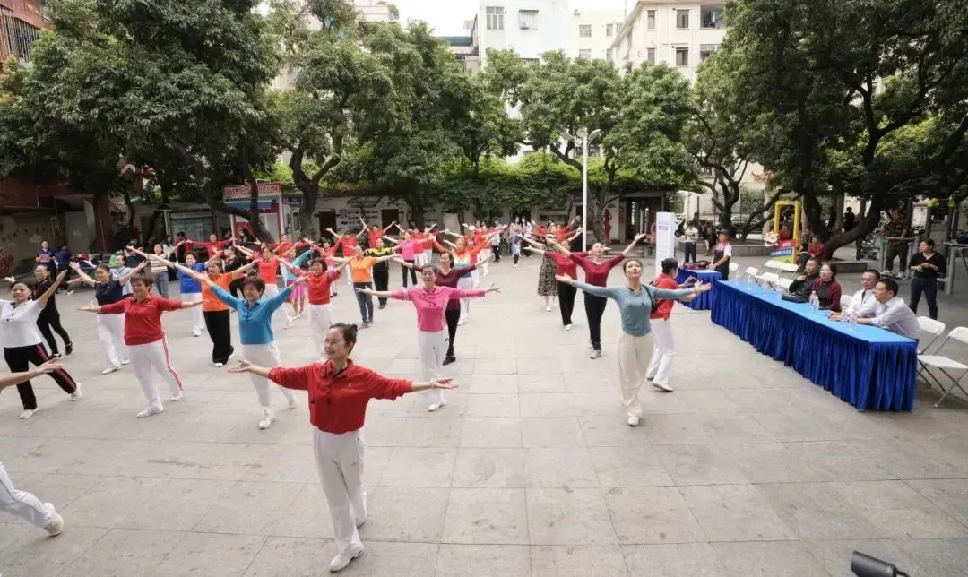 在南山街道向南广场里,深圳市南山区广场舞协会正在举行2023年深圳市“无噪新舞潮”静音广场舞推广活动。