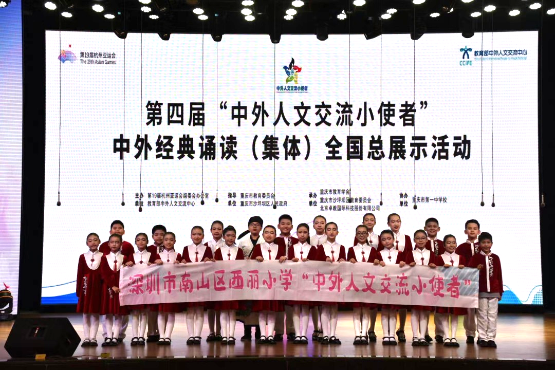 深圳新闻网2023年12月21日讯(记者 徐哲康)2023年12月15日至17日,由第19届杭州亚运会组委会办公室、教育部中外人文交流中心主办的第四届“中外人文交流小使者”中外经典诵读(集体)全国总展示活动在重庆第一中学举行,西丽小学中英文诵读节目喜获一等奖,是近年来南山区中小学在此项赛事中取得的最高荣誉。