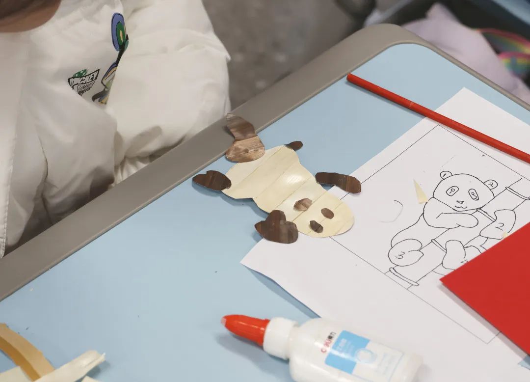 第二节课,袁桂喜老师让同学们动手操作,制作属于自己的“熊猫”麦秆画。