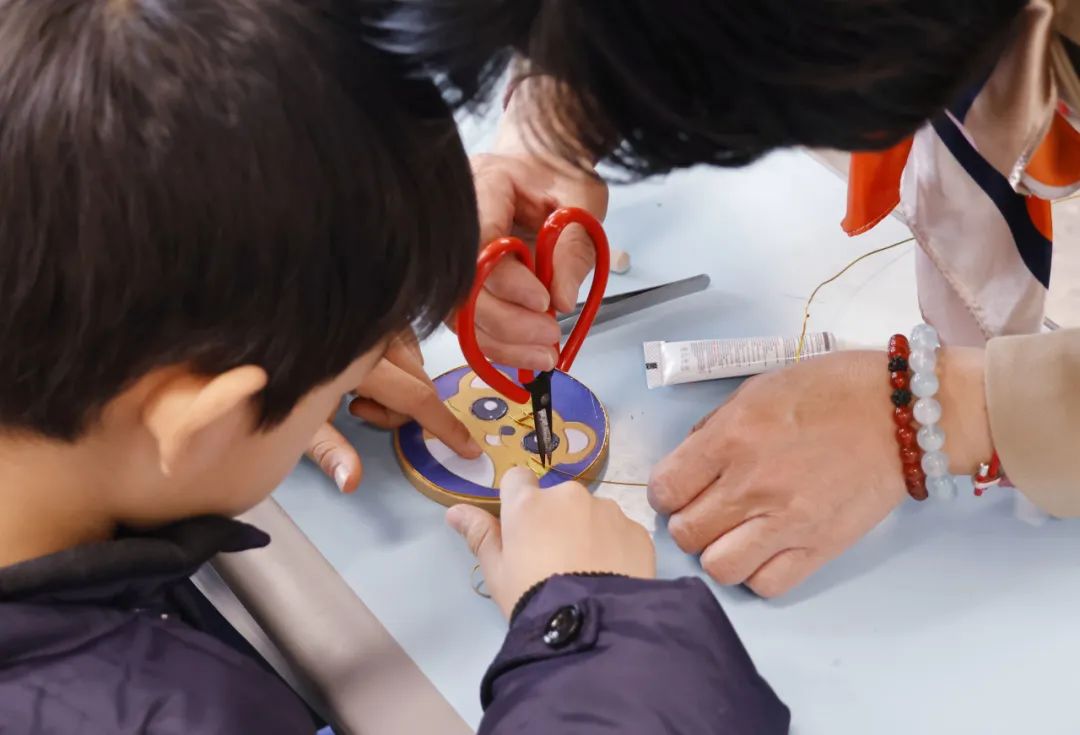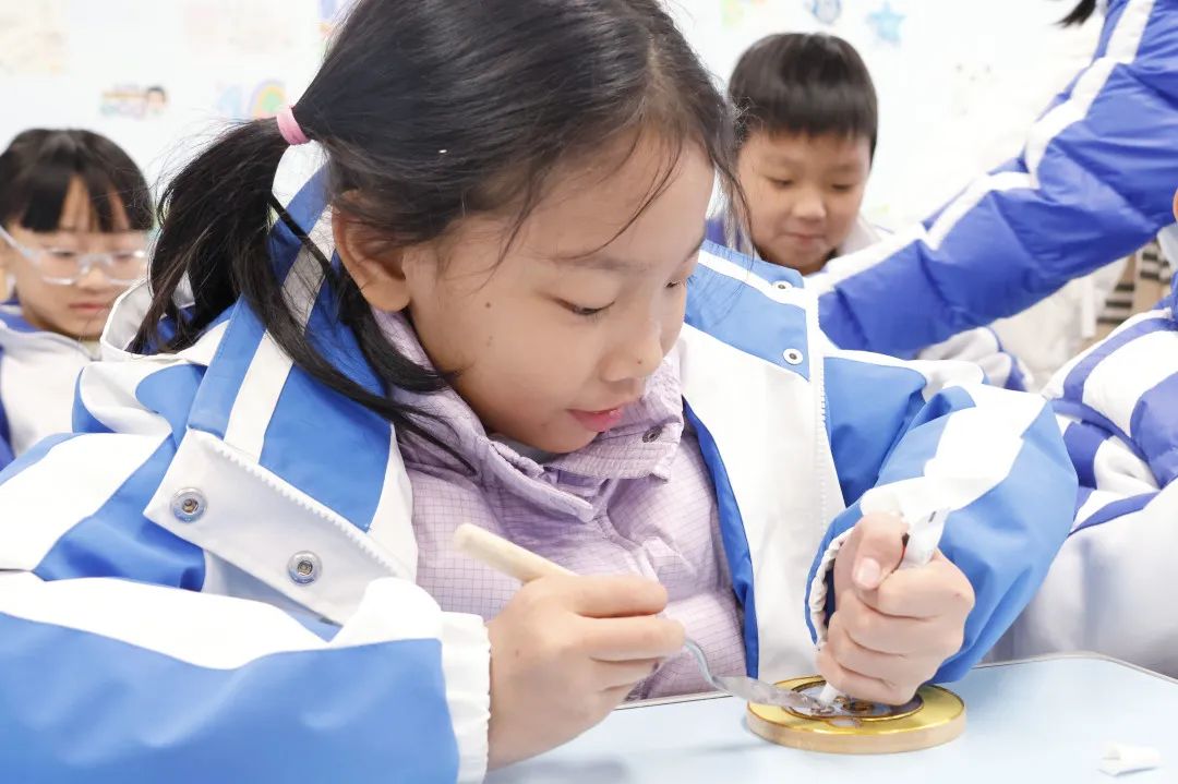 在课堂上,老师们先介绍了国家级非物质文化遗产景泰蓝的掐丝、上色等制作工艺,然后充分发挥他们的专业知识,耐心指导学生们使用不同的工具和材料,展现景泰蓝制作技艺的魅力。学生们积极踊跃地参与其中,一丝不苟地按照老师们的示范,亲自动手体验了杯垫的制作工艺流程。