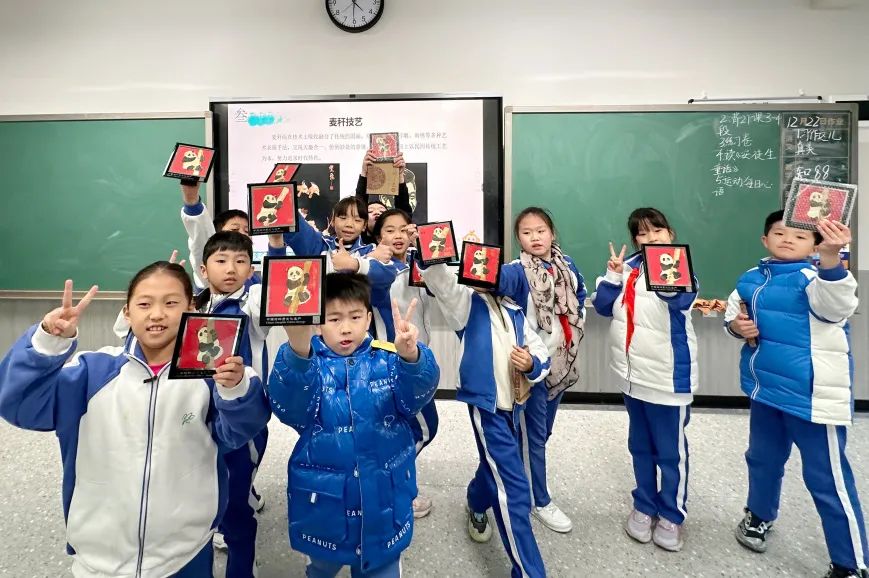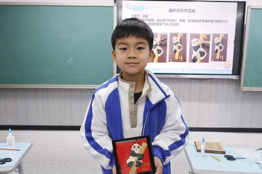 通过两节课的努力,同学们亲手制作出了属于自己的“熊猫”麦秆画。