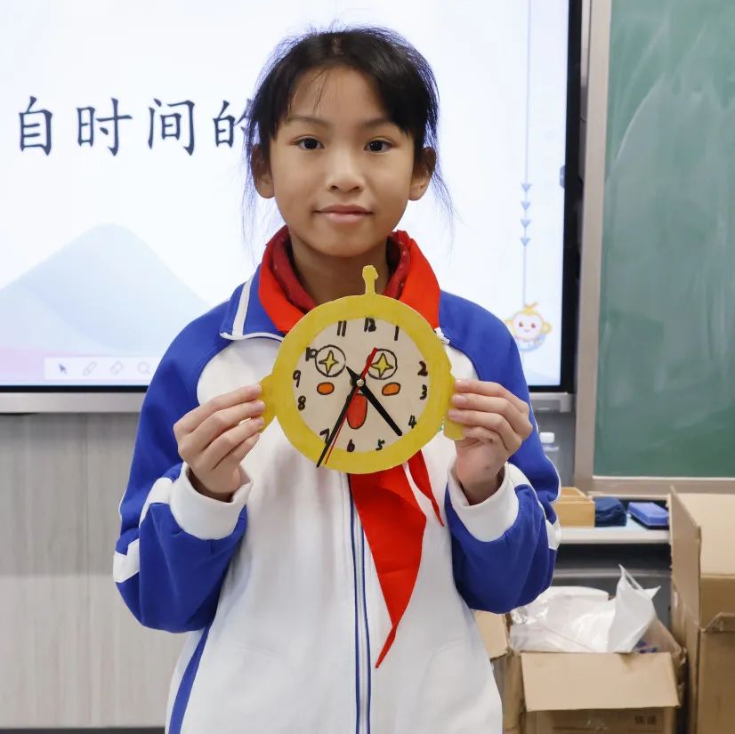 最后,同学们使用胶水,将小木棒跟木板做成了支架,一个别出心裁的时钟就制作完成了。