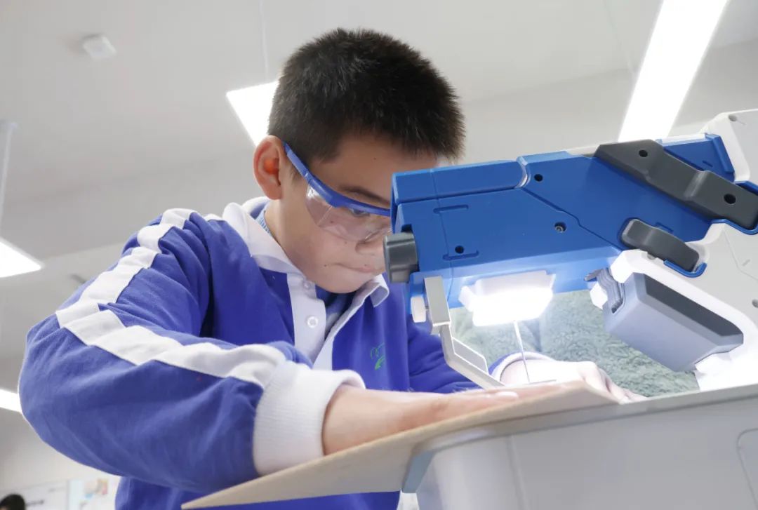 第二步是切割,同学们化身“小木匠”,通过一台台切割机,将木板切割成目标图案的形状。第三步是打磨,一块块木板经打磨后变得光滑、“有形”。第四步,同学们为表盘装上电池机芯盒,一节5号电池让同学们亲自设计的时钟“活”起来了。