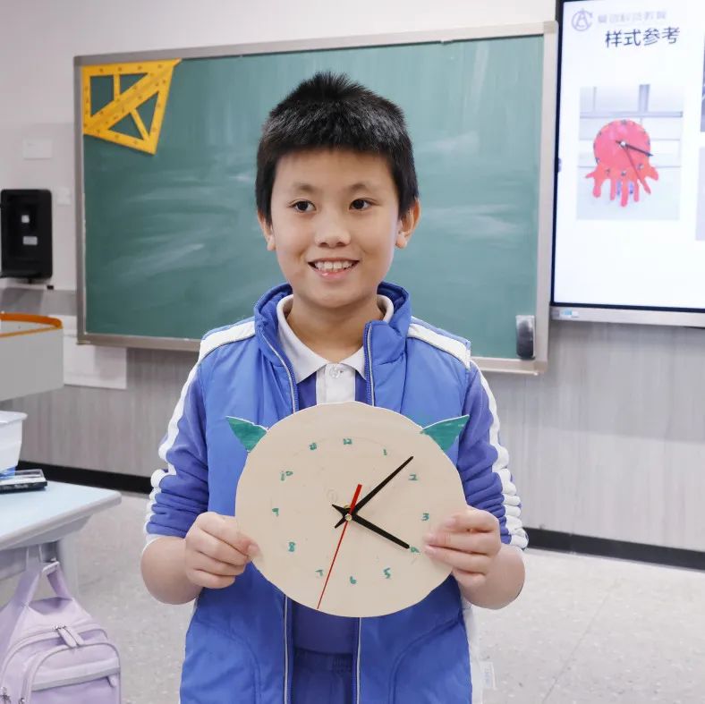 第一步是设计表盘,在一块块平平无奇的木板上,同学们精心设计了美丽、可爱的图案,比如篮球、蛋仔派对、猫咪、龙等,同学们还在科学老师的指导下标上了精准的时钟刻度。