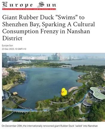 同时,南山戏剧节、深圳公共艺术季也让南山别有韵味。今年12月,近30个国家和地区的50多家媒体网站同时关注到“巨型大黄鸭‘游’到南山深圳湾”。欧洲《太阳报》、法国新闻网、希腊《先驱报》、《休斯顿镜报》、爱尔兰新闻网等境外媒体在报道中称:“南山区以创新创业活动的高度集中以及现代产业集群而闻名,致力于建设人文、艺术、环境和谐共生的诗意城市环境。”