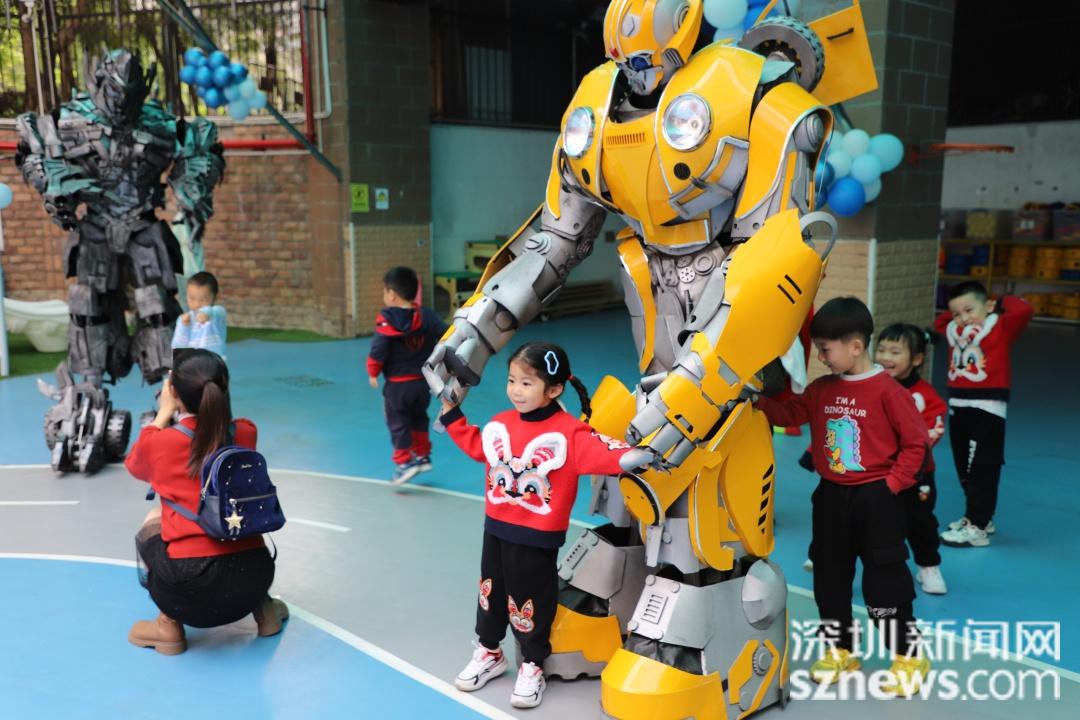 “妈妈你看,是大黄蜂!还有太空飞船!”“这是我们和老师一起搭建的火箭发射装置……”开幕式当天,校园里科技感十足,迎接小朋友入园的是超级人气变形金刚大黄蜂和威震天,十分吸睛。校园主干道两旁,摆满了师生、家长为本届科技节准备的科技装置、手工作品,写满了孩子们对科学世界的无限畅想和憧憬,尽显童趣。