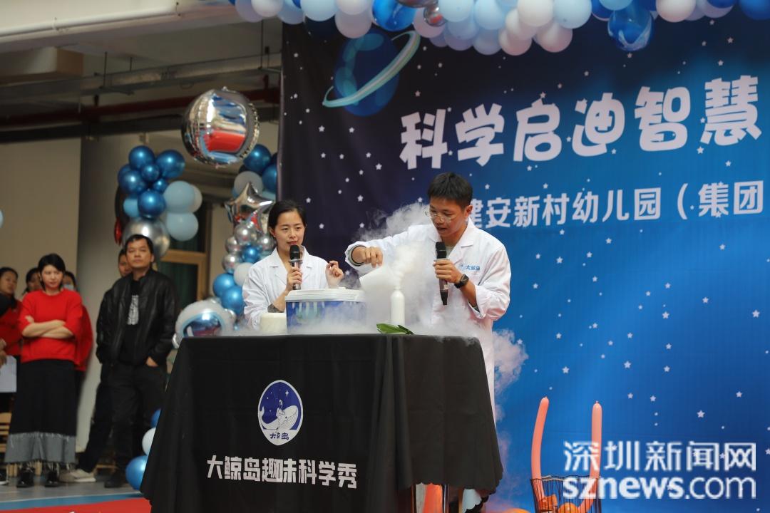 随着主持人的精彩介绍,天骄幼儿园首届科技节进入开幕式环节。建安新村幼儿园(集团)总园长乔影宣布科技节活动的正式开幕,她寄语孩子们“用科技之光点亮奇思妙想,一起推开神秘又充满魅力的科技大门,尽情感受科学的无穷乐趣”,并期望好奇心和探索精神能伴随孩子们的一生。随后,由宝安区科技创新服务中心带来的趣味科学秀将现场气氛推向高潮。液氮实验、“会变声”的氦气、空气大炮……轮番上演的科学小实验让小朋友们欢呼连连,直呼“太神奇了!非常有趣,像魔法一样”。科学秀表演老师通过实物展示、生动讲解和互动提问,让孩子们与科学来了一次亲密接触。现场还设置了体验环节,邀请孩子们走上台,一起参与实验,触摸科技的神奇,让孩子们深刻了解到生活中各种有趣的科学现象和科学知识,大大激发了他们对科学的学习兴趣和探究欲望。