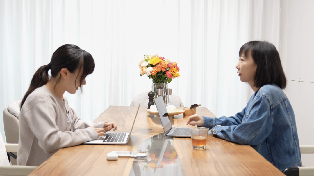邱羽墨(左一)与妈妈徐琳(右一)讨论开发思路。