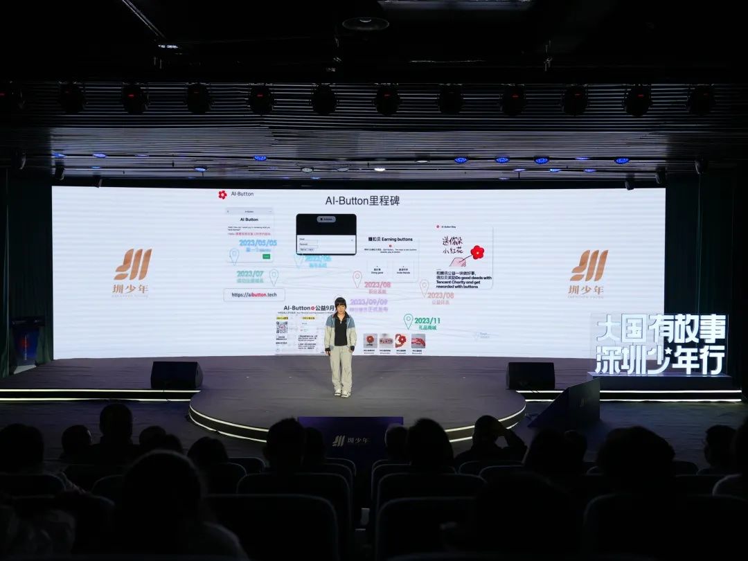 在2023“大国有故事 深圳少年行”演说大会现场,邱羽墨以产品经理的身份,向听众介绍AI-Button。